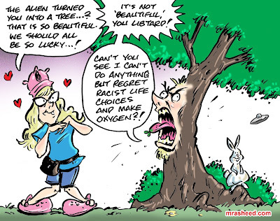 ARTIST'S DESCRIPTIONThis #MRasheedCartoons image was inspired by some of the middling white racist attempts to puzzle out how they could spin being turned into a tree for their unrepentant crimes against my ethnic group as some sort of left-leaning tree-huggy positive, but who cares? As long as you recognize that, as a tree, you would not be able to get into anymore mischief, then the point is made. Thanks for playing.