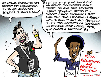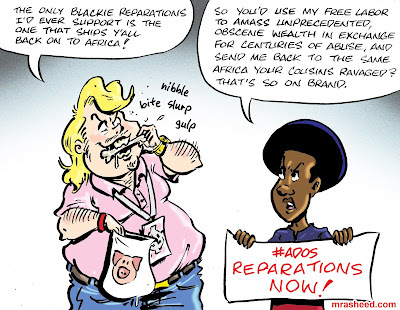 ARTIST'S DESCRIPTIONThis #MRasheedCartoons image was inspired by the routine comments from the global network of white racists proclaiming to their fellow racists that they'd prefer shipping Black Americans to Africa as some kind of charitable event, despite "charity" having noting to do with Reparations. A robust reparatory justice program designed to make the American descendants of slavery whole is what my government owes my ethnic group after centuries of allowing lineage-based, accrued discrimination, preventing us from building wealth over generations. Fixing these wrongs is not charity, and sending me to the alien land into the hostile arms of the people who sold me to you in the first place doesn't fix my issues. All that kind of talk means is that whites want to use me, throw me away and tell me to shut up. That talk -- and the traditions of domestic terror that it describes -- is why they are my enemy. Of course, they will claim that pointing that fact out is "divisive," but again, that kind of self-serving, gaslighty foolishness is why they are my enemy.