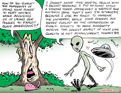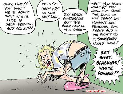 ARTIST'S DESCRIPTIONThis #MRasheedCartoons image was inspired by the middling white racist's trait of pretending that their use of force to subjugate the Black American former slave class for perpetual exploitation and plunder of our inheritance wealth is no less wrong than an advance being using its force to punish them for their wrongs. As tempting as it may be to think their just clueless and confused, I certainly know them better than that, so I'll keep countering their silliness until they finally break and admit to what they are sloppily hiding behind their weak "superior eye-cueist" ideological fantasies.