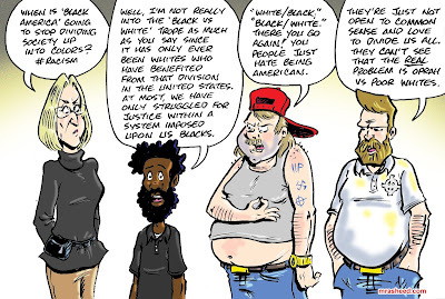 ARTIST'S DESCRIPTIONThis #MRasheedCartoons image was inspired by the widely performed gaslighting technique by white racist all over the globe, where they are actively trying to indoctrinate the Black American into believing that the racism divide in the United States is all our fault as if we invented it. Is it possible that this is a psychopathic attempt at trying to spin various forms of the "Black is Beautiful" movement into a weird-assed "reverse racism" marketing assault? Very probably. What we all know for sure (whether your severe anti-Black racism allows you to admit it publicly or not) Is that the American descendants of slavery have NEVER! benefited from the race-based economic divide in the USA. White people control $115 trillion of the $136 trillion in national household wealth precisely because they erected and savagely maintained the "white vs black" dichotomy that fueled their whitopian aristocracy. Trying to blame the whole thing on us -- while also pretending we're all wealthy NBA stars or whatever else dumb-assed thing they regularly spew to hide from justice & integrity -- is in fact yet more anti-Black racism of the kind they have long perfected.