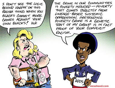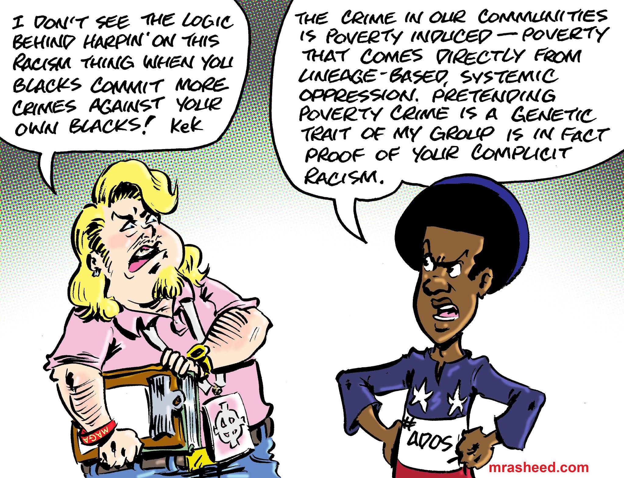 ARTIST'S DESCRIPTIONThis #MRasheedCartoons image was inspired by the ever-present usage of the "but what about black-on-black crime?!" white racist talking point. These middling white racists I've been engaging lately very well may have originated the tactic, back a generation or so.