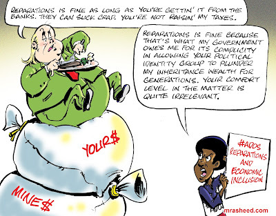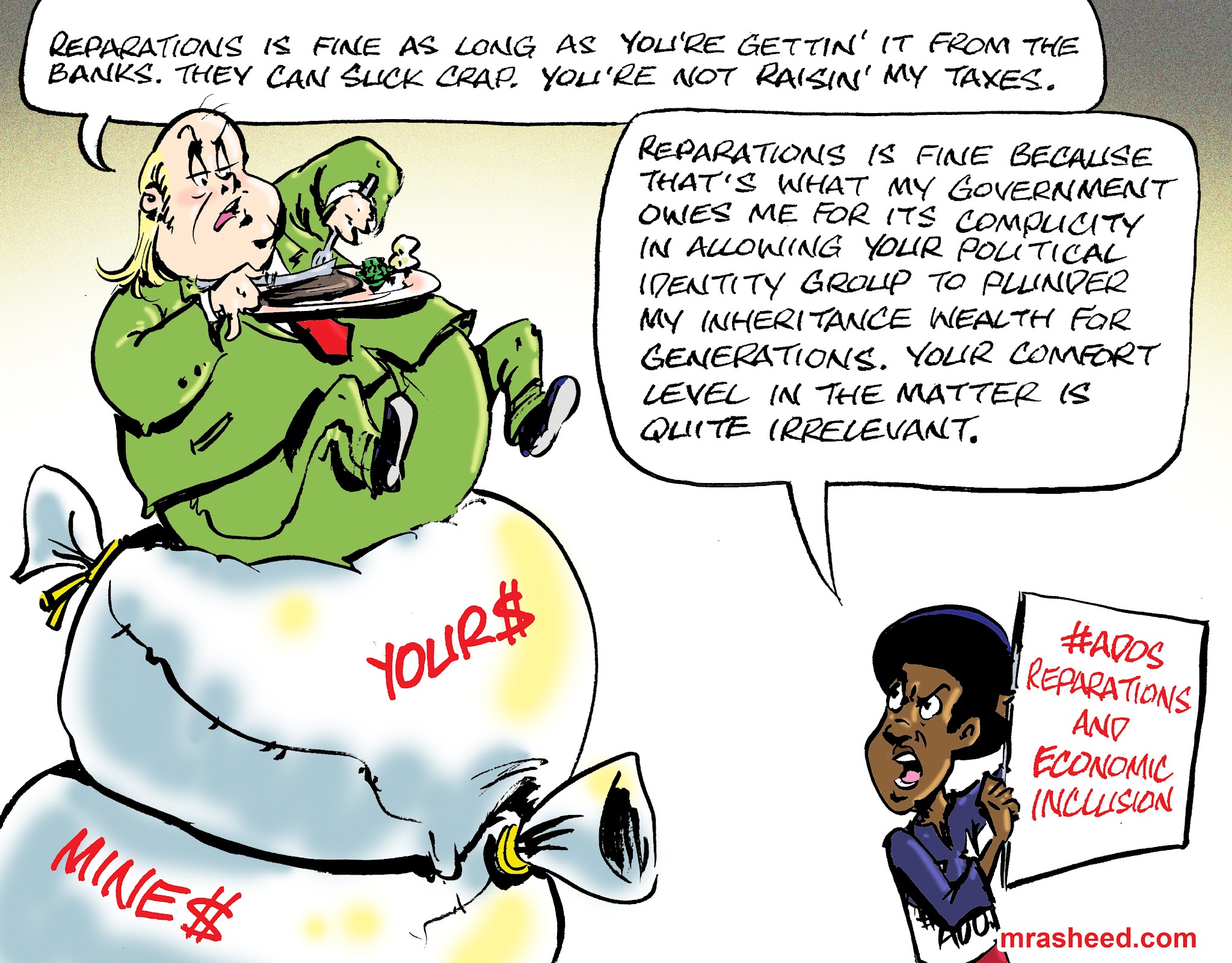 ARTIST'S DESCRIPTIONThis #MRasheedCartoons image was inspired by a response to one of my comments over on YouTube, where a snarky white supremacist demonstrated the entitled arrogance caused from half a millennium of bullying, violent theft and a culture of lying and pretending he's done nothing at all.