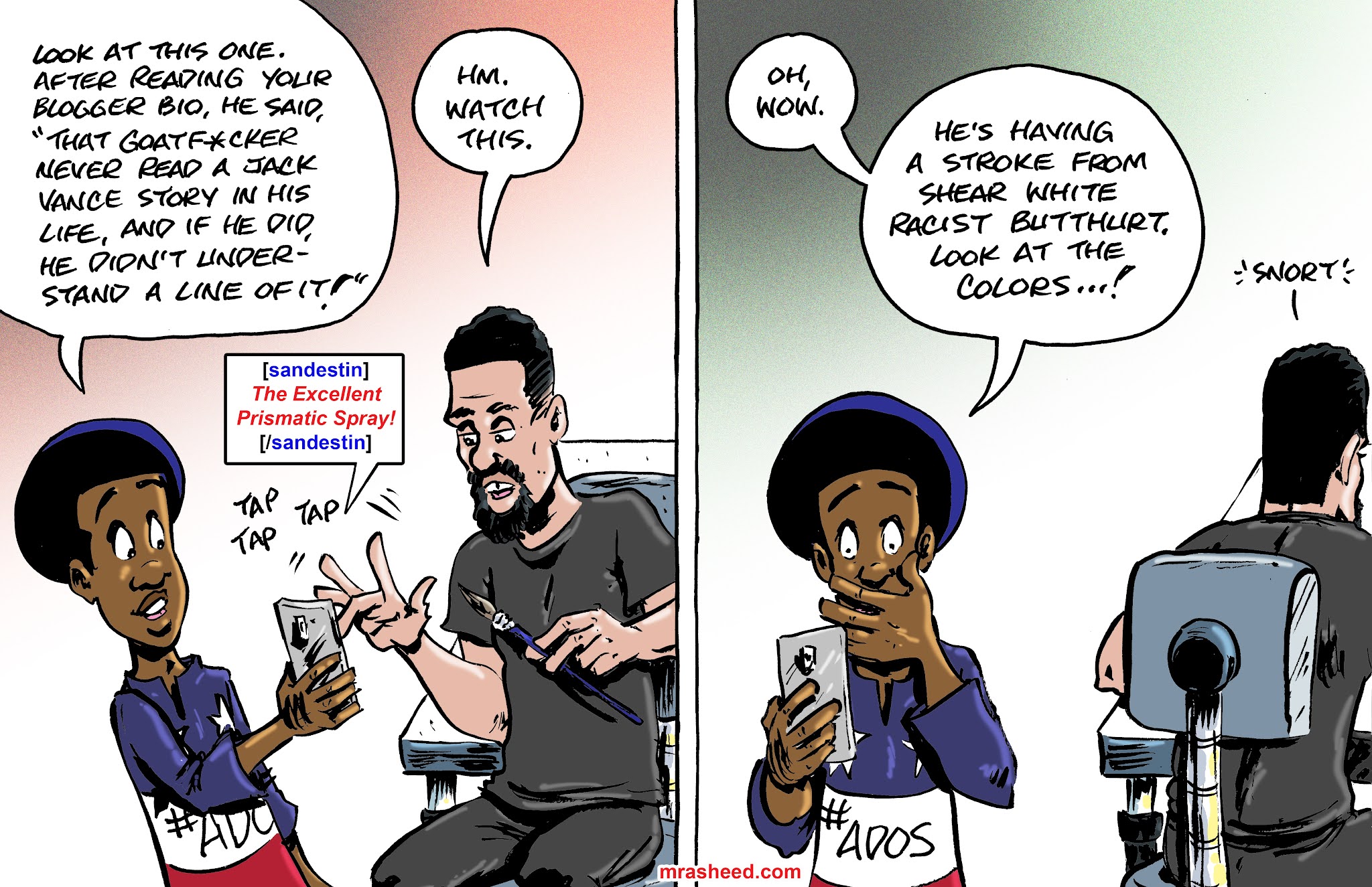 ARTIST'S DESCRIPTIONThis #MRasheedCartoons image was inspired by the weaponization of this old cartoon by my middling white racist foes, seeking to use their twisted translation of the insightful encounter it caricatures to paint me as a lemming-like fool. lol Nice try, but it was only one guy, and his confirmation of a controversial subject that is so easy for the mainstream to treat as a fringe "conspiracy theory" not worth taking seriously is appreciated.
