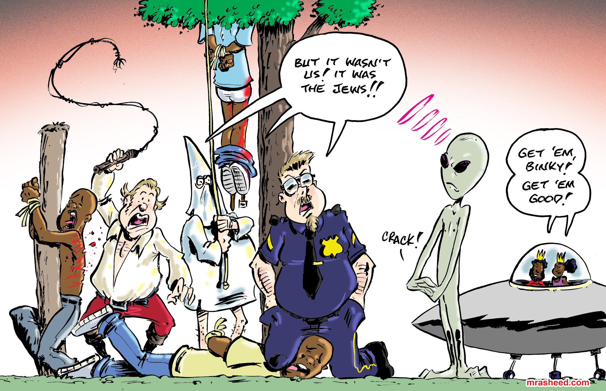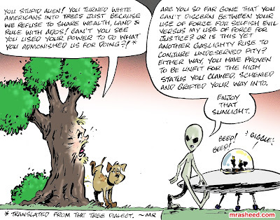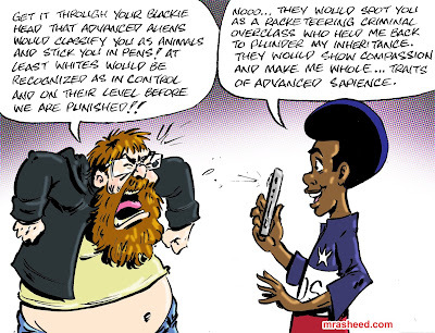 ARTIST'S DESCRIPTIONThis #MRasheedCartoons image was inspired by all the chimpin' out middling white racists who are aghast at a previous cartoon in my alien visitation series with the implication that they would be punished for their lineage-based systemic racism against the American Descendants of Slavery. In a particularly weird manifestation of the infamous white entitlement psychosis, the white racist aristocracy not only believes that they should be allowed to inflict any & every demonic evil upon the world with impunity, but they also interpret violent punishment (capital or vigilante) as the literal exact same thing as what they did. This type of crazy you cannot argue with, only point and laugh at (and caricature).