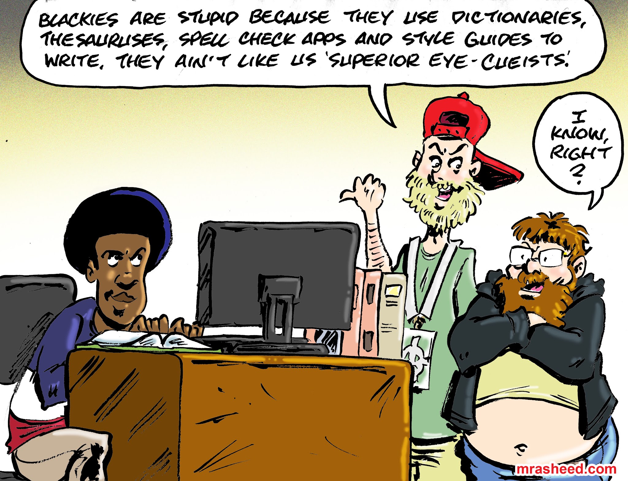 ARTIST'S DESCRIPTIONThis #MRasheedCartoons image was inspired by the numerous drive-by trolls among the middling white racist community who take time out of their busy trolling schedules to post under my toons that they feel my work should be completely different from what I create, and to post the "we wuz kangs" white supremacist mantra. Unfortunately, the shear volume of these types of posts prevent me from commenting on every single one, nor would it make much sense for me to do so since they are designed in their quantity as zombie-like hive mind/group think, which is the white racist aristocracy's greatest strength. Instead I've decided to create this toon to acknowledge their hard work as a group. Thanks, guys. You are seen and appreciated for your service. ;)