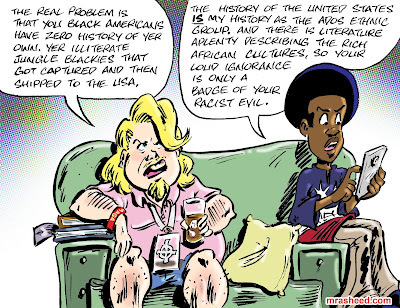 ARTIST'S DESCRIPTIONThis #MRasheedCartoons image was inspired by a colossal level of ignorance that still manages to take me aback despite all I know about that demographic ("They still make you?!" ~Chris Rock). This is the kind of stuff they used to say to the slaves in an effort to break their spirit -- there was NOTHING going on in Africa and they did us a favor by enslaving us and allowing us to taste of the cast off scraps of a white "civilization" as it were. ("You get to taste the best cast off scraps of any of the world's n1993rs! You should be grateful!"). The educated elite would know better, as a casual glimpse into the contemporary opinions of the Ancient Greeks would attest, but these middling white racists -- and their penchant for reinforcing favored lies amongst each other until they actually start believing them to be true -- is what the toon above showcases. If you push back on their foolishness, then on cue they will call you an 'idiot' or 'moron' as if it is you who are the stupid one.