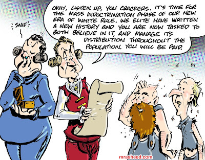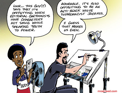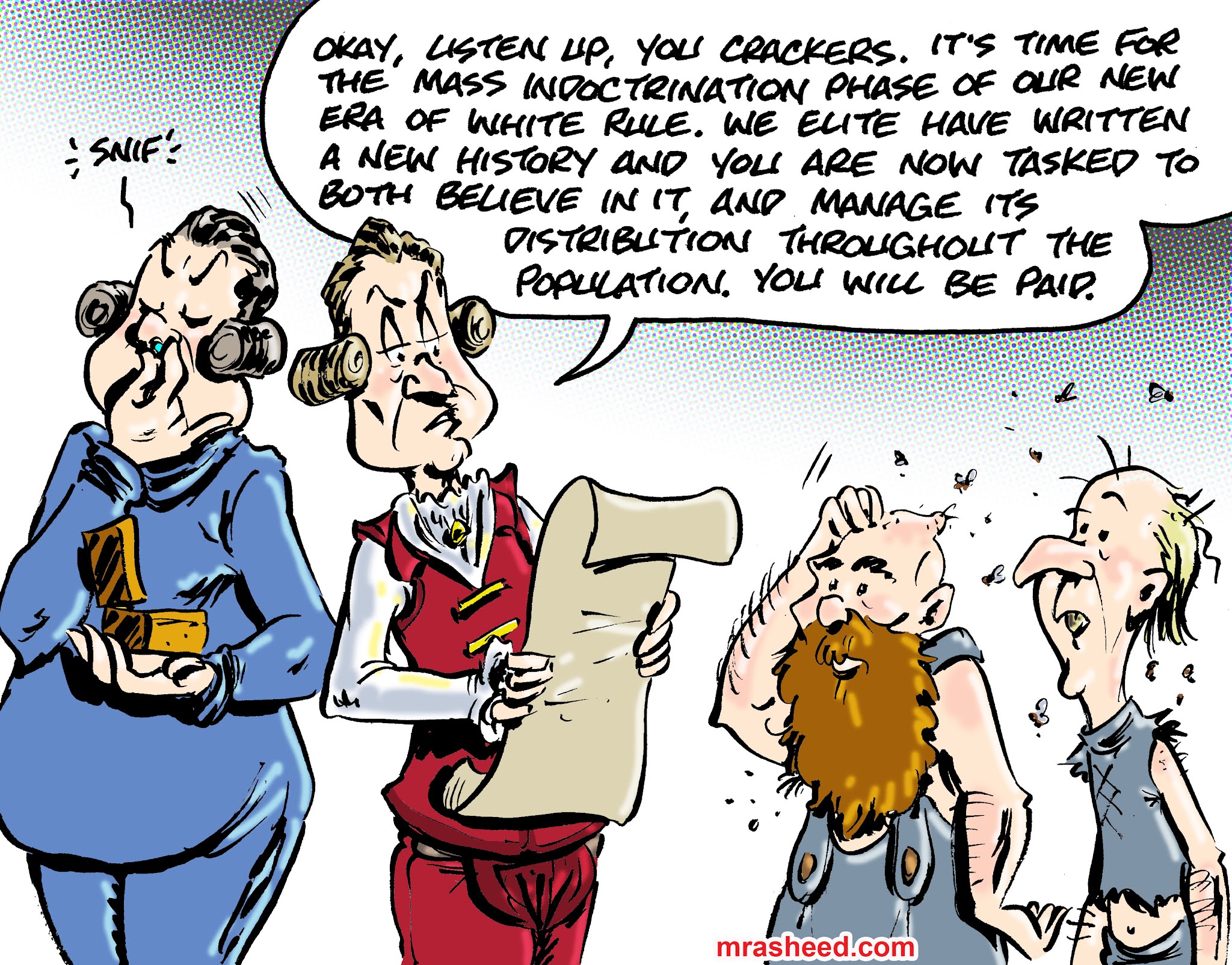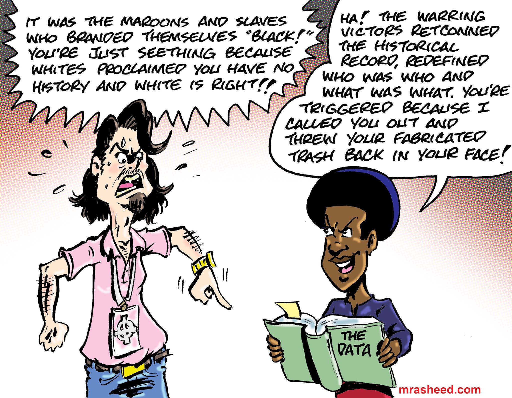 ARTIST'S DESCRIPTIONThis #MRasheedCartoons image was inspired by a comment by a triggered, middling white racist upset when it was pointed out that it was the colluding Euro-ethnic groups who branded themselves "white" during the rise of their global Imperialist reign of terror. Originally they tried to use Western Christianity as their brand until it was pointed out that their victims could just convert themselves out of the lower caste. In any event, there was a clear difference between a people referring to themselves as "black" as a purely shallow physical descriptor versus the highly-lucrative bondsman tool of free labor labeled "black" by the white racist aristocracy.