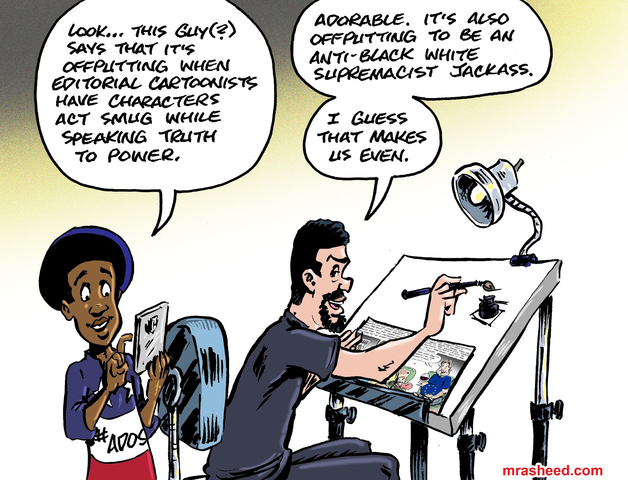 ARTIST'S DESCRIPTIONThis #MRasheedCartoons image was inspired by the real life comment made by a faux-helpful middling white racist. This fake 'advice' comes from the same "how we prefer you protest our evil so it doesn't inconvenience us" bag as the folk you find complaining about activists stopping traffic, etc. Stop talking to me. All you need to do is stop being evil. That's it. Running your damned mouth about how you are checked is a treacherous nonessential to the process.