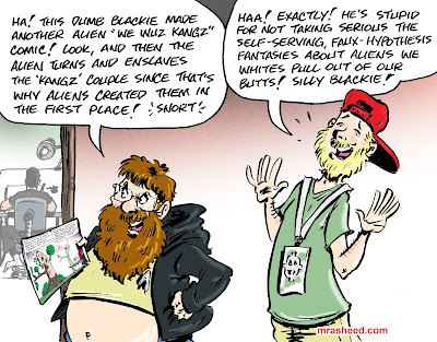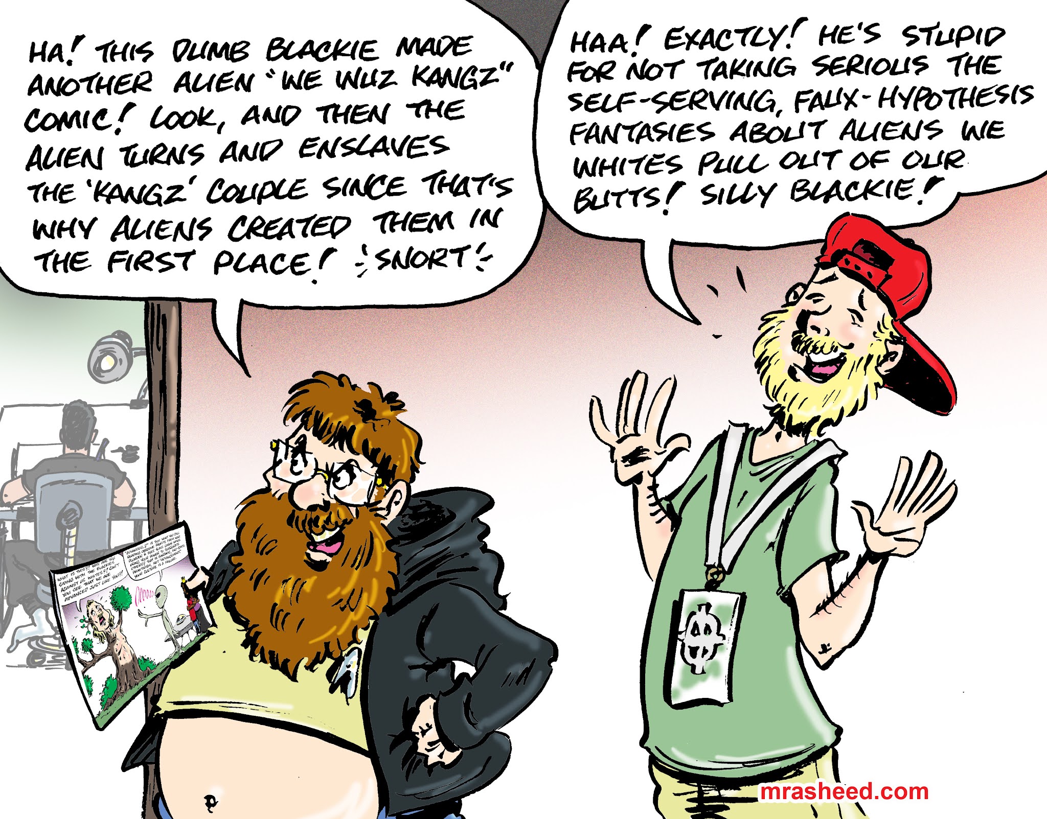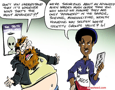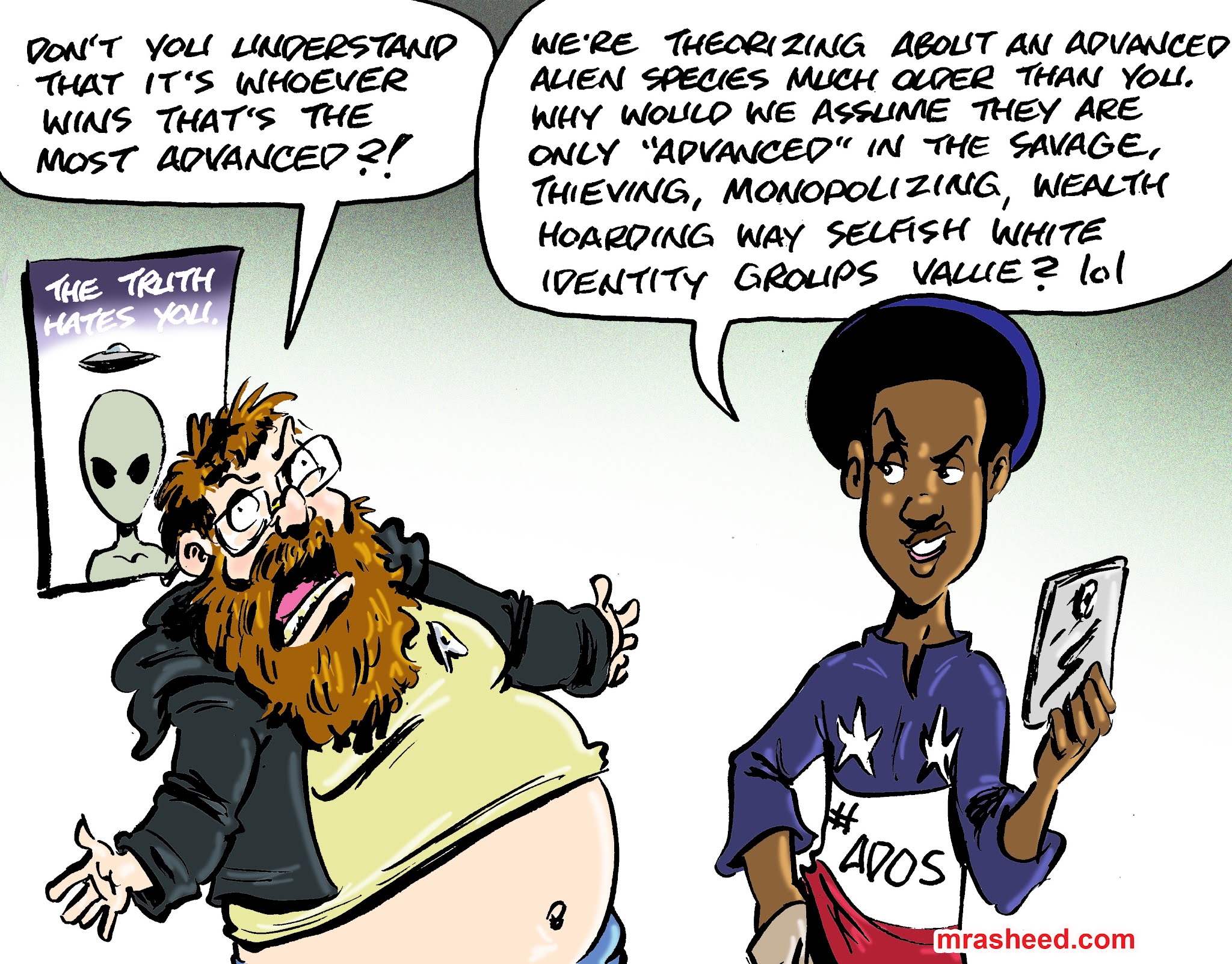 ARTIST'S DESCRIPTIONThis #MRasheedCartoons image was inspired by the same theme as the previous toon, where I'm challenging a gagglefuk of middling white racists of their goofy, self-servingly limited usage of the concept of "advancement" when it comes to the visitation of an alien species.