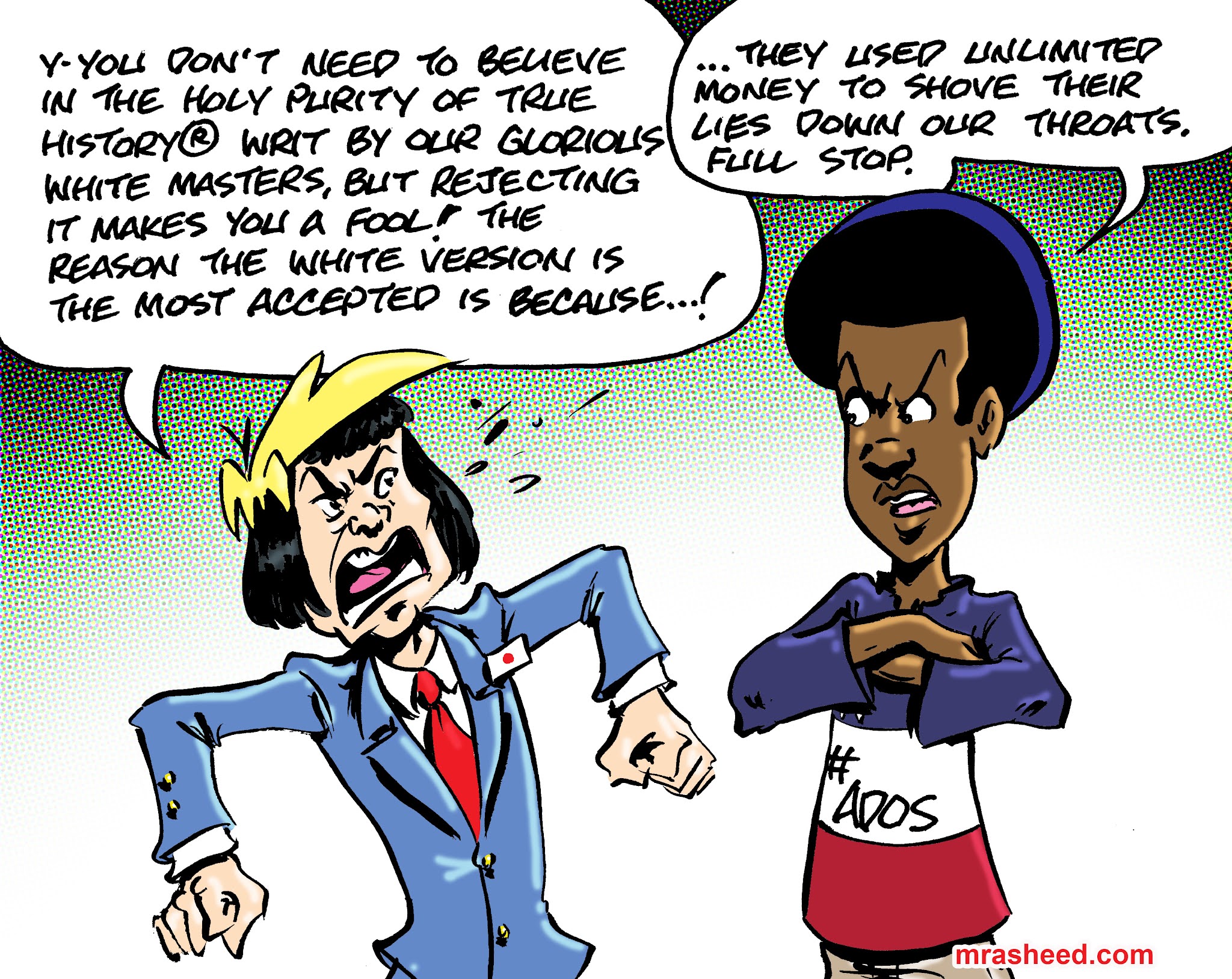 ARTIST'S DESCRIPTIONThis #MRasheedCartoons image was inspired by the rabid zealotry with which the middling whit racist protects and defends the "history is written by the victors" pack of lies we know as the white narrative of mainstream historical literature. They really defend it as if it's their religion, like literally everything being hinged upon a blind acceptance.