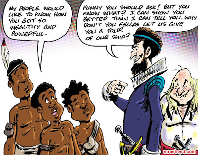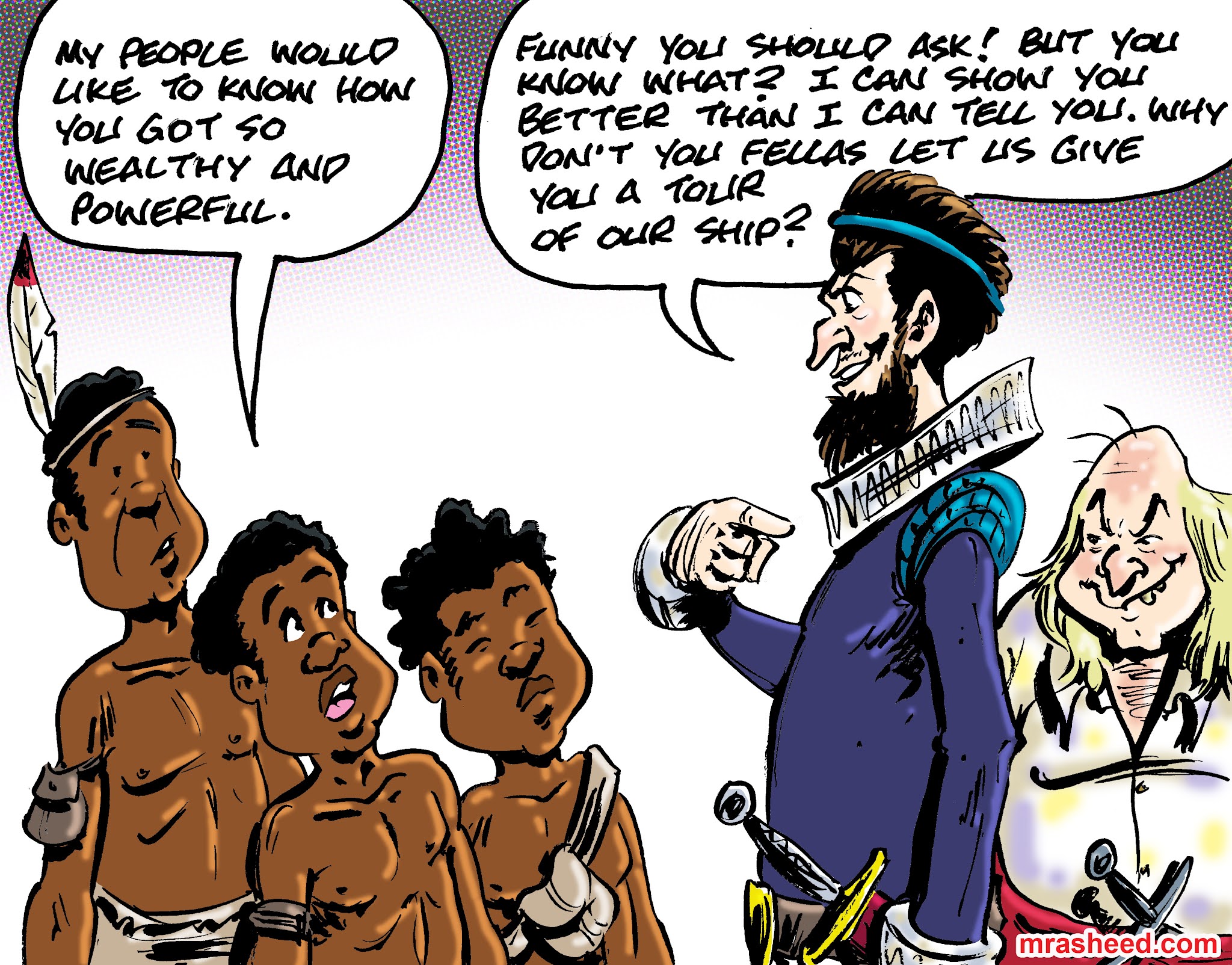 ARTIST'S DESCRIPTIONThis #MRasheedCartoons image was inspired by a meme I saw posted frequently by middling white racists, the message of which is pointed in the other direction with the European conquerors asking the natives how did they get so "poor & primitive." That's ridiculously stupid, of course, since the peoples in question had actually been thriving on the land for ages in cultures countless years old -- a people who by the time Columbus, et al., met them they had lost more lore than these uninsightful goobs will ever know.