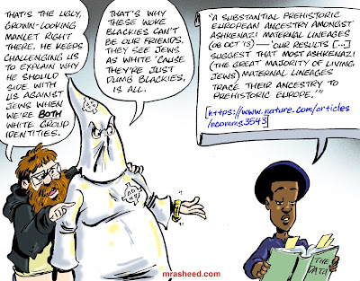 ARTIST'S DESCRIPTIONThis #MRasheedCartoons image was inspired by this relentless hard-sell attempt by the entire middling white racist "incel" community that the Jews are somehow not white and are a completely different people. Obviously this ridiculous song-n-dance is more than just traditional racist ideology, but it's also a pagan belief system in its own right, since it has only the wishes & feelings of the goofy true believers to buoy the foolishness.
