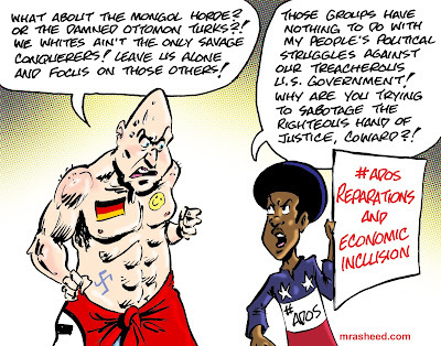 ARTIST'S DESCRIPTIONThis #MRasheedCartoons image was inspired by a sociopathic trait continuously performed by middling white racists all over the world, where they will loudly attempt to distract from their own white racist crimes by deflecting to some other group who conspicuously has zero to do with the current societal ills we're dealing with. They are most likely to do this silly two-step when triggered by the word "Reparations" in context of the American Descendants of Slavery.