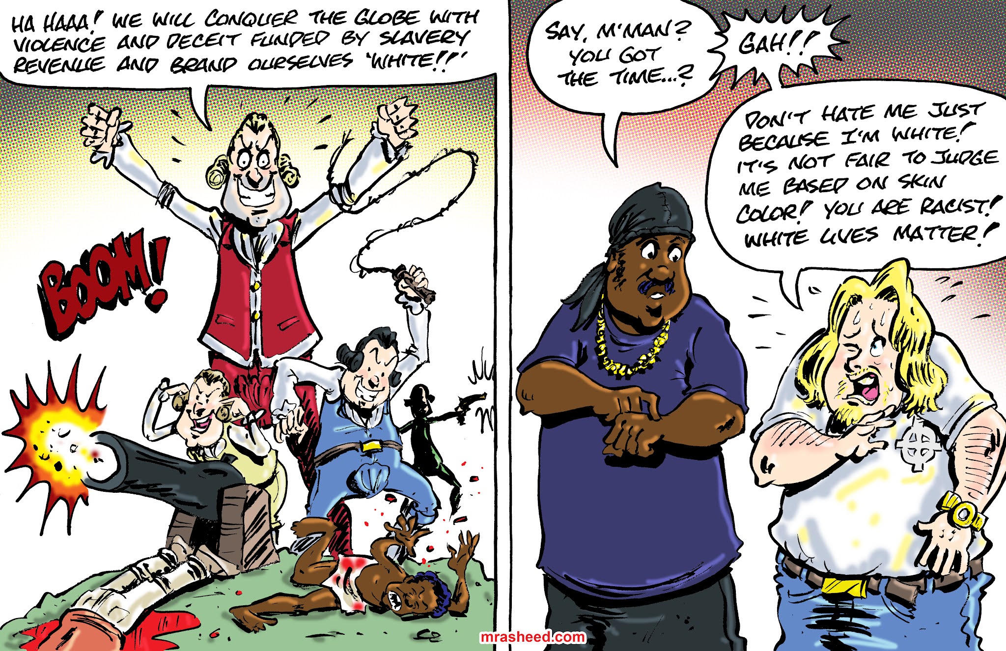 ARTIST'S DESCRIPTIONThis #MRasheedCartoons image was inspired as the response to a cartoon by an artist pandering to the middling white racist crowd, coddling the “just being white will be a hate crime!” nonsense. To be clear, “racism” as we know it in the West was birthed when the enslaved Black Africans were permanently delegated to a chattel bondsman class, which created a “white racist aristocracy” by default. Formal slave codes and later black codes were created designed to strictly enforce the second class/bottom caste position of Black Americans which influenced the culture at every level. When slavery was finally abolished the second-class citizenship status was enforced anyway – why? Because whites benefited from slavery as an economic system, since businesses didn’t have to pay worker salaries, the white racist aristocracy pocketed the wealth that would have normally accrued for Black American inheritance over the generations. When slavery was abolished, whites resented that they had to give up that slave class revenue and even treat the freedmen as societal equals, competing against them in the markets! So second-class citizenship was imposed upon them so whites could continue to exploit the group.