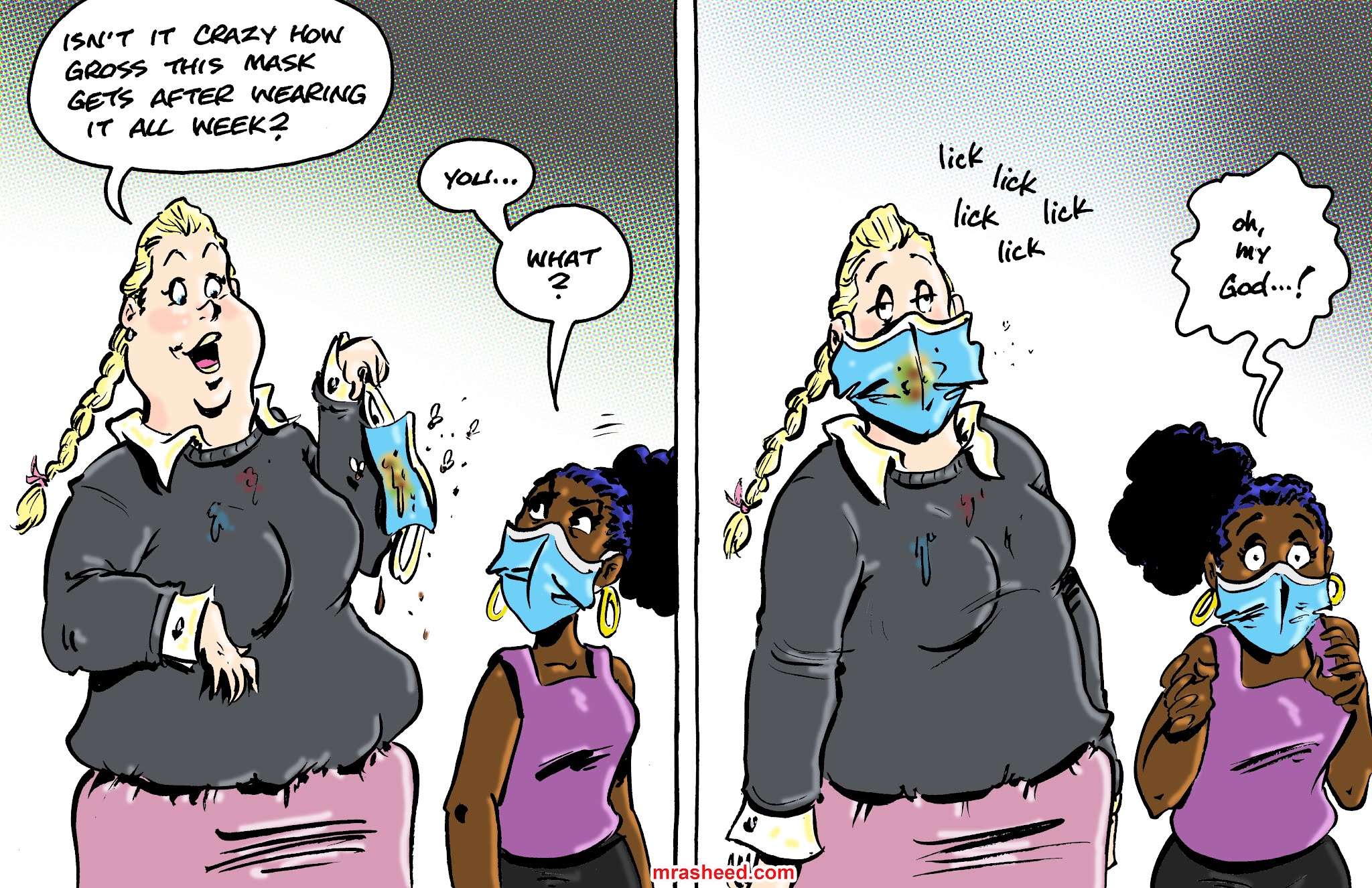 ARTIST'S DESCRIPTIONThis #MRasheedCartoons image was inspired by a post I saw a few weeks ago where a celebrity casually mentioned that the mask she wore all the time was so disgusting. I made a note to maybe caricature it as a gag later, but didn't get the motivation until the other day when I was discussing a cosplay performance by someone who dressed as Stephen King's Annie Wilkes character from his Misery novel. The cosplay actor stood out to me because she not only dressed up per King's description instead of as Kathy Bate's interpretation, but she did such a great job I actually recognized what she was doing almost instantly.