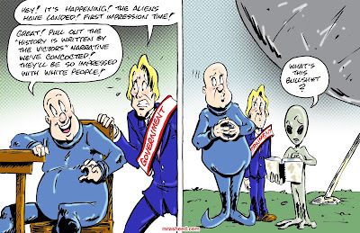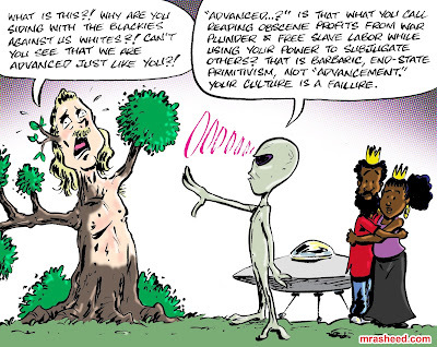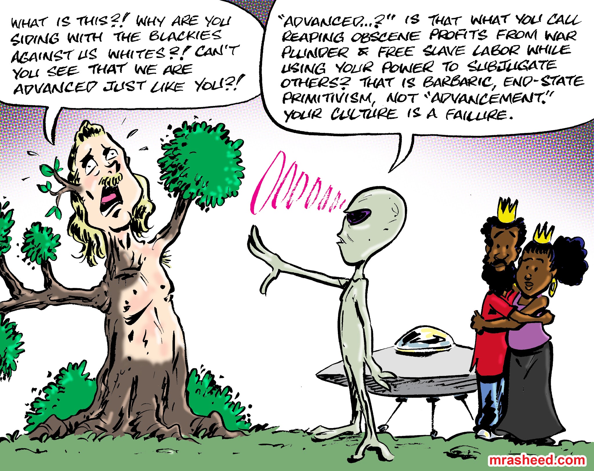 ARTIST'S DESCRIPTIONThis #MRasheedCartoons image was inspired by the several middling white racists who responded to the previous alien toon in the series with indignation because they comically associated the white racist aristocracy with the alien visitor's "advanced" state. #adorbs This is clearly yet another blow to the fictional "superior-IQ" fantasy, since the very idea of grifting/stealing wealth from the masses so a selfish few legacy families can hoard the majority resources and play with the money to make penis rockets would be considered "advanced" is stupid as hell. lol