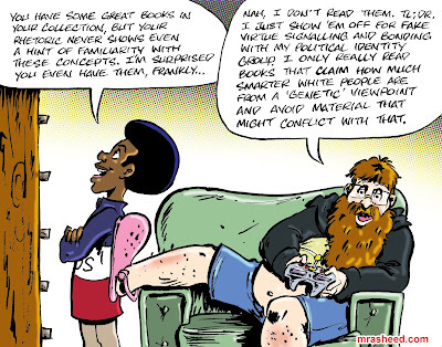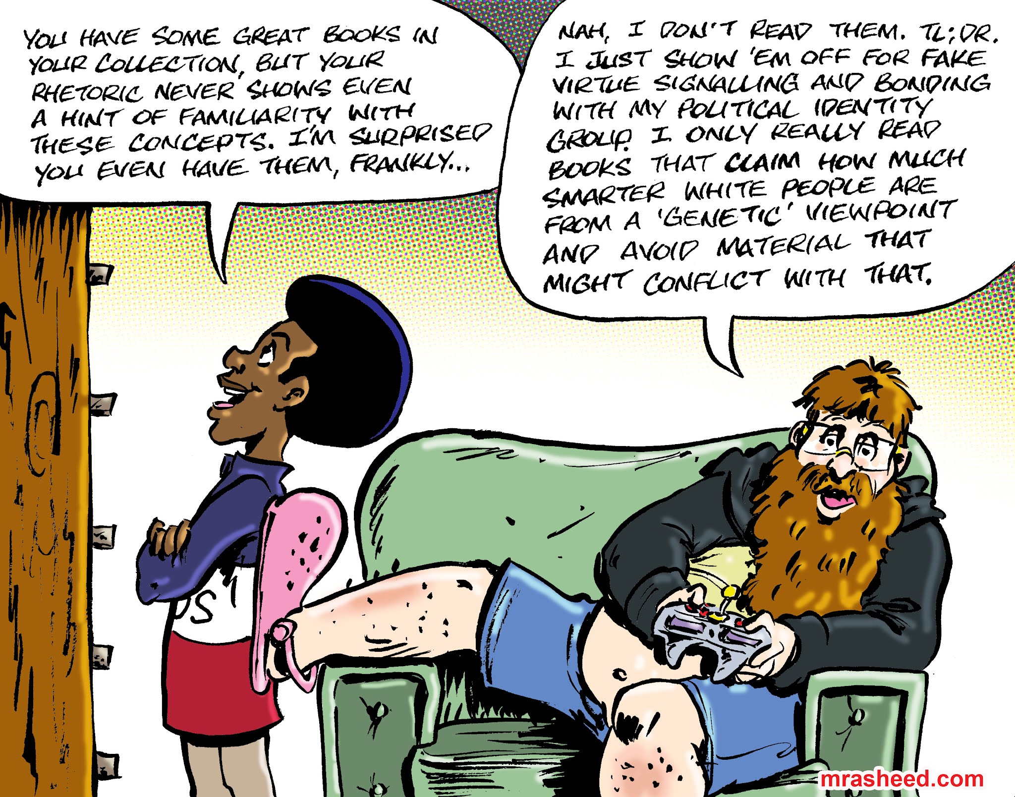 ARTIST'S DESCRIPTIONThis #MRasheedCartoons image was inspired by the fact that I came across several threads in which this new crop of middling white racists I've recently made the acquaintance of have been sharing these actually really awesome 'MUST READ!' book lists with one another (often accompanied with free eBook download links to my delight). The problem is that at least half of this material they all swear by reveals the true nature of the White Supremacist Ideology and the anti-Black systemic racism for which it stands, and yet they all enthusiastically and uncritically worship it anyway -- and without a single hint that they've bothered to read these same books they hoard. So in light of all of this, what ELSE am I supposed to think, other than be amused at the gift horse of a smoking gun confirming their commitment to self-serving tomfoolery?