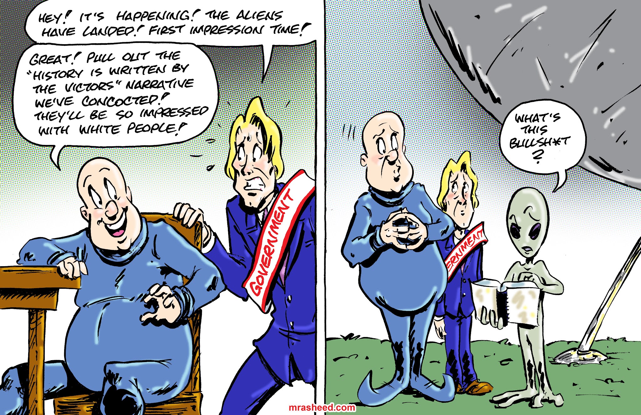 ARTIST'S DESCRIPTIONThis #MRasheedCartoons image was inspired by the ongoing sarcasm and sneers projected at my most popular cartoon, which was created as the cover illustration to an old FB thread discussing how aliens would actually respond if they came to earth from the #WhenTheAliensCome hashtag trend. Intrigued by the topic, I addressed it both from a theist standpoint and from the racism position, turning the assumptions of the white supremacist community upside-down, much to their chagrin. Here I noticed many newcomers commenting on the old toon, having stumbled upon it for the first time as they also expressed a sarcastic incredulousness that the aliens wouldn’t simply accept whatever the white racist aristocracy told them about humans with no questions asked. Meanwhile, we all agree the visitors would be a species much more advanced than us, and from many close encounter reports, even possess telepathic abilities and can read minds, yet we’re supposed to believe that they will be quite vulnerable to the sloppy and arrogant gaslighting tactics of greedy white people that don’t even work on ME. lol