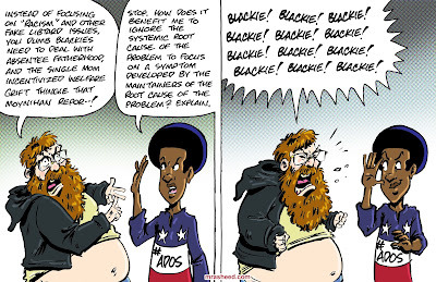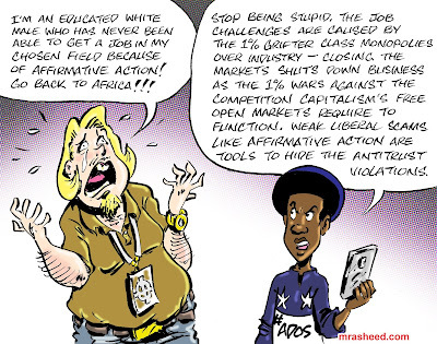 ARTIST'S DESCRIPTIONThis #MRasheedCartoons image was inspired by a whining, self-pitying post similar to this one, in which a sorry middling white supremacist blamed all of his woes in life upon Black Americans through partisan rival politics. This despite the fact that white liberals are every bit as committed to preventing the American Descendants of Slavery from receiving our long overdue Reparations and economic inclusion. They are so committed to keeping us in a state ripe for continued exploitation that during the Civil Rights Era, they sabotaged our struggle for desegregation and an economic empowering Black Political Agenda, to replace them with a catch-all “Assimilated Integrationist Token” grift scheme. This means that instead of helping us become whole with the return of our stolen accrued inheritance wealth and closing the lineage-based wealth gap, are supposed allies instead accelerated the rise of the Second Gilded Age of monopolist rule, allowed blatant anti-trust violations as normal national business policy which decimated Black business across all industries, and pretended it was “progress” by setting aside fake “diversity hire” positions within white-owned mega-corporate powers pretending that was in compliance with the economic inclusion of civil rights law.