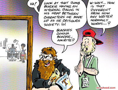 ARTIST'S DESCRIPTIONThis #MRasheedCartoons image was inspired by the comments made by a few middling white racists who called themselves critiquing my use of the trope in which I had a caricature of myself having a dialog with one of my characters over one of the points I discuss in my body of work. They honestly tried to give the impression that an artist expressing his message through fictional characters was a concept that I invented as an expression of some form of special Black person psychosis. Yes, this is the very same political identity group that wants us all to think they are genetically more intelligent than everyone. Right.