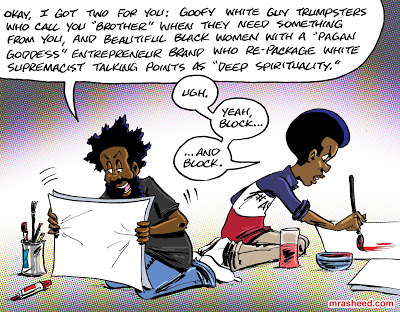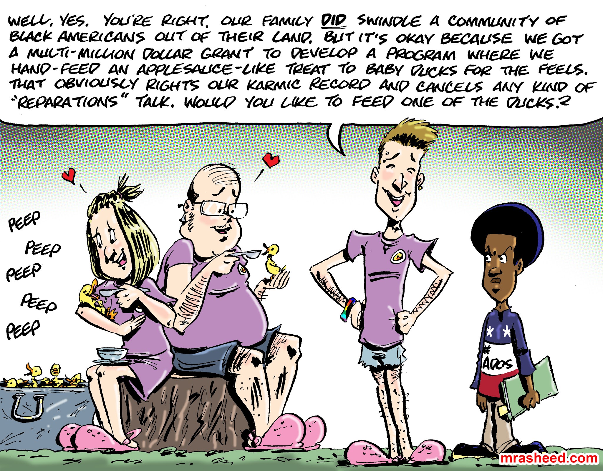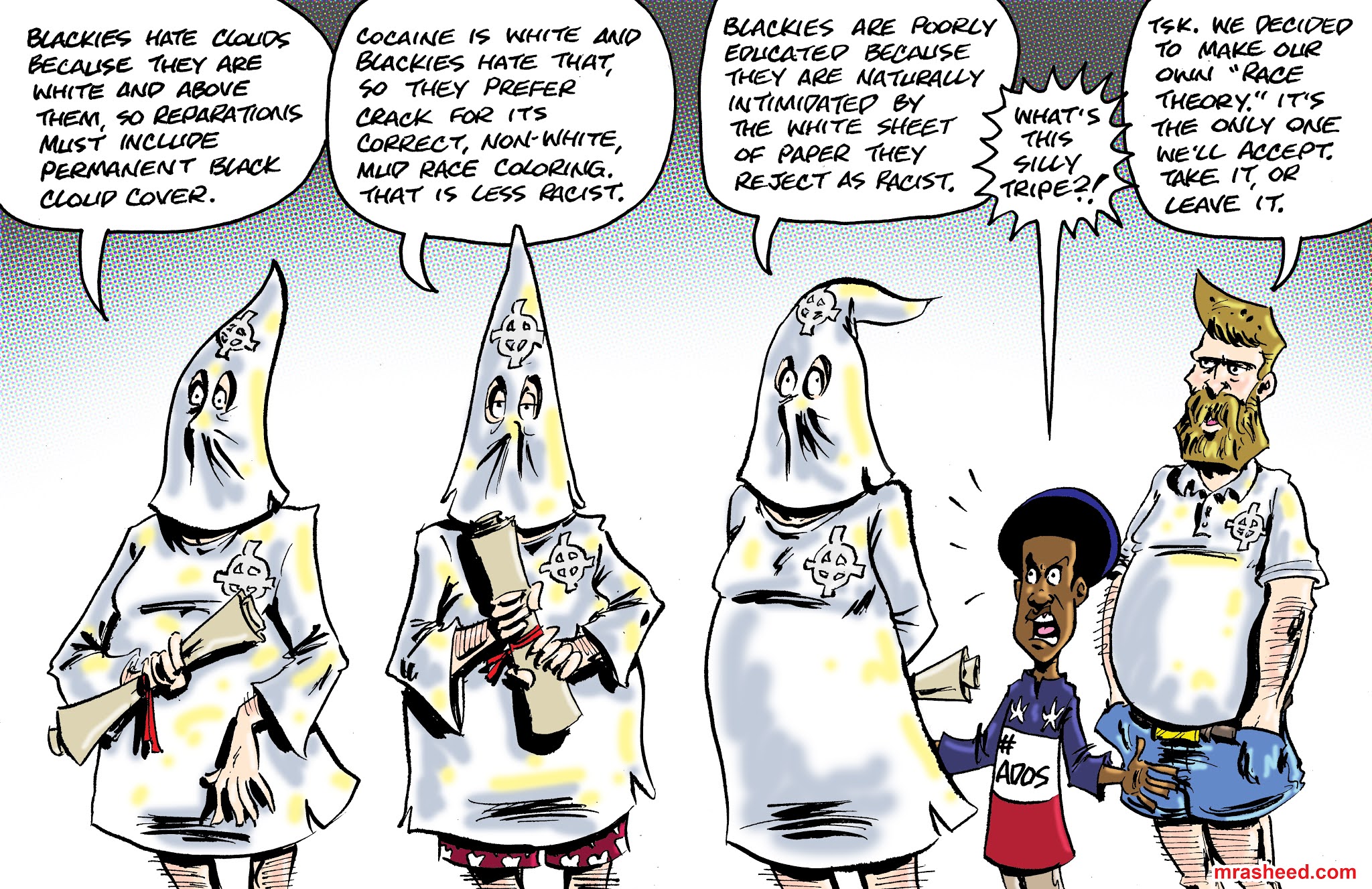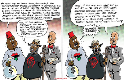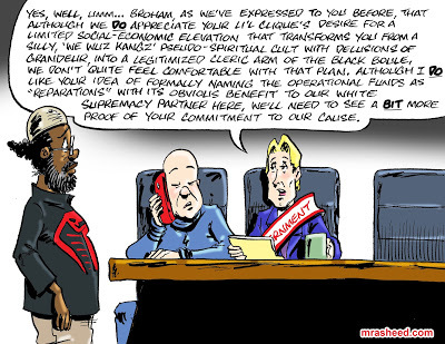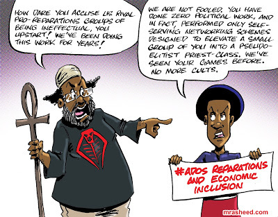 ARTIST'S DESCRIPTIONThis #MRasheedCartoons image was inspired by this Tweet critiquing one of the #ADOS movement's bitter haters whose oft-repeated butthurt mantra is all the years they've been advocating for Reparations. They standout in all of this by the conspicuous nothing they've accomplished in the last three decades of their pseudo-activism, one marked by a blatant disdain for the very politics the Black American former slave class requires to be made whole. Obviously their entire silly shtick is a grift scheme to elevate their li'l leaders to a priest class among the boule, little different in function to any other group partnered with white supremacy to keep a group unstable and subjugated for continued exploitation.