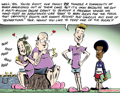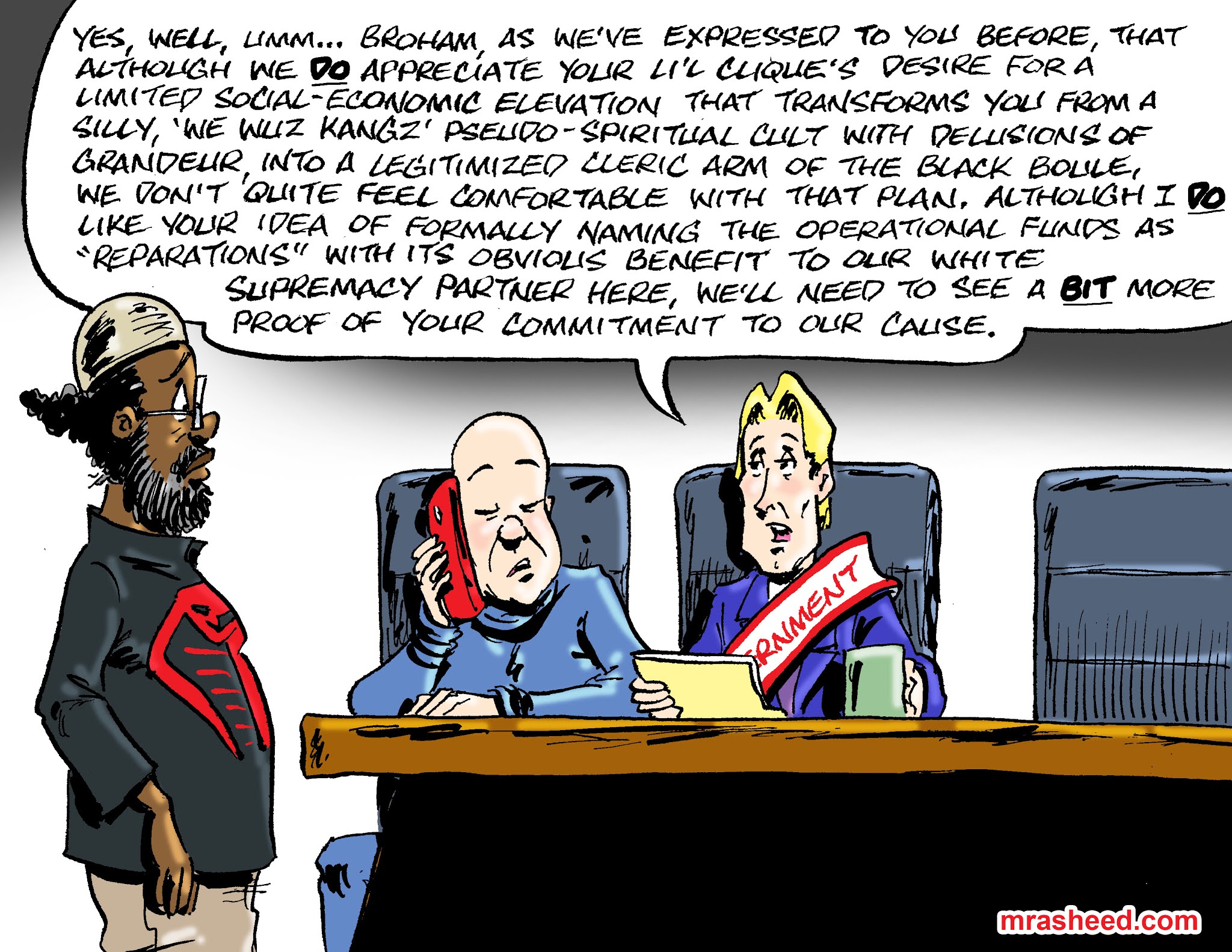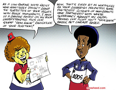 This #MRasheedCartoons image was inspired by the uninformed comments of of one of the more nutso characters on a certain message board, in which he decided to make an MS Paint graphic based on his admittedly poorly understood grasp of my critique of Black immigrants hostile against my ethnic group's pro-Reparations and economic inclusion activism.