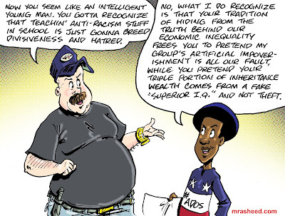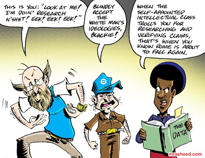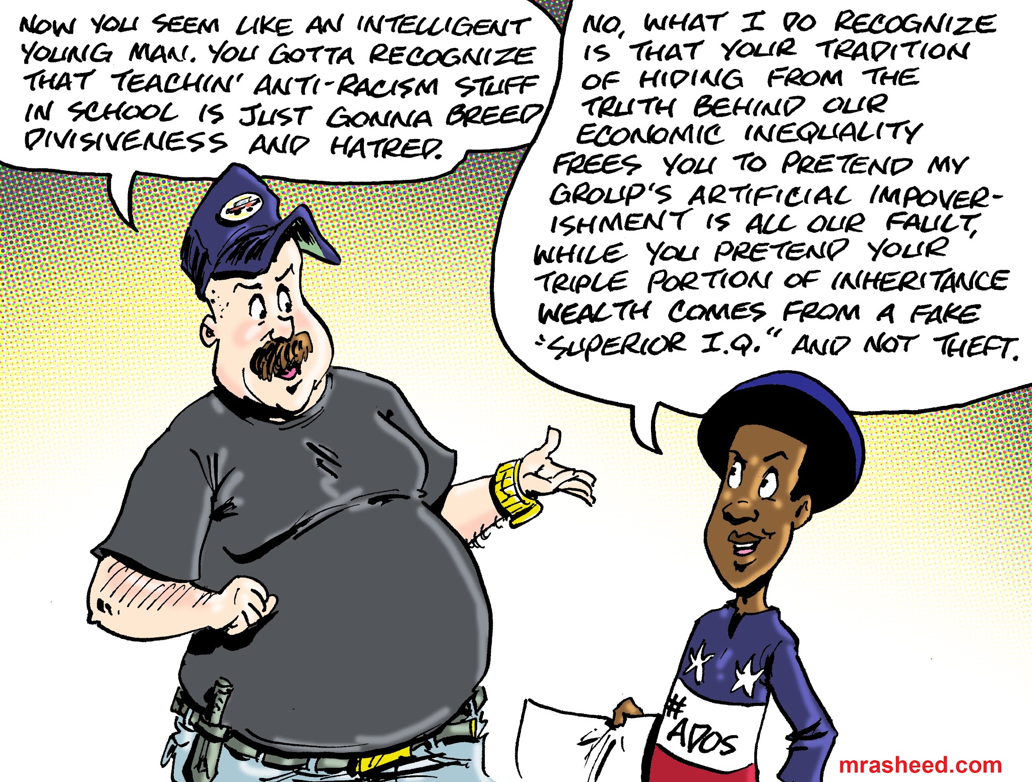 ARTIST'S DESCRIPTIONThis #MRasheedCartoons image was inspired by an FB meme that actually attacked people for doing research instead of caving in to mob bullying pressure to just blindly accept – whatever. The fact, that it was shared and enthusiastically Amen’d by the liberal sect, who as you know present themselves as the smart one of the two who’s supposed to be pro-scholarship, pro-knowledge, etc., was more than just a little offensive. Watching the left-side of white supremacy let their true face peek out so often lately is awesome to behold.
