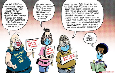 ARTIST'S DESCRIPTIONThis #MRasheedCartoons image was inspired by the fact that it’s common knowledge at this point that no actual viral material is present within this experimental “gene therapy technology” serum, yet the extraordinarily deluded crowd is not only going around calling it a “vaccine” but they are acting like it performs like a vaccine in their gestapo-like bullying/pressuring people to get the shot. It’s notable that, after a slight hesitancy, the general populace started running out to get the thing, and it didn’t take long for them to start proudly announcing that they got it done, using similar celebratory social media posts (while dancing!) as performed during “I just voted. Did you?” boasting. I’m unconvinced that they can all be this trusting and stupid. I’m sure by now they’ve seen that they have absolutely jumped the gun and are now trying to pressure everyone else to get the shots too so they won’t be alone in their stupidity.