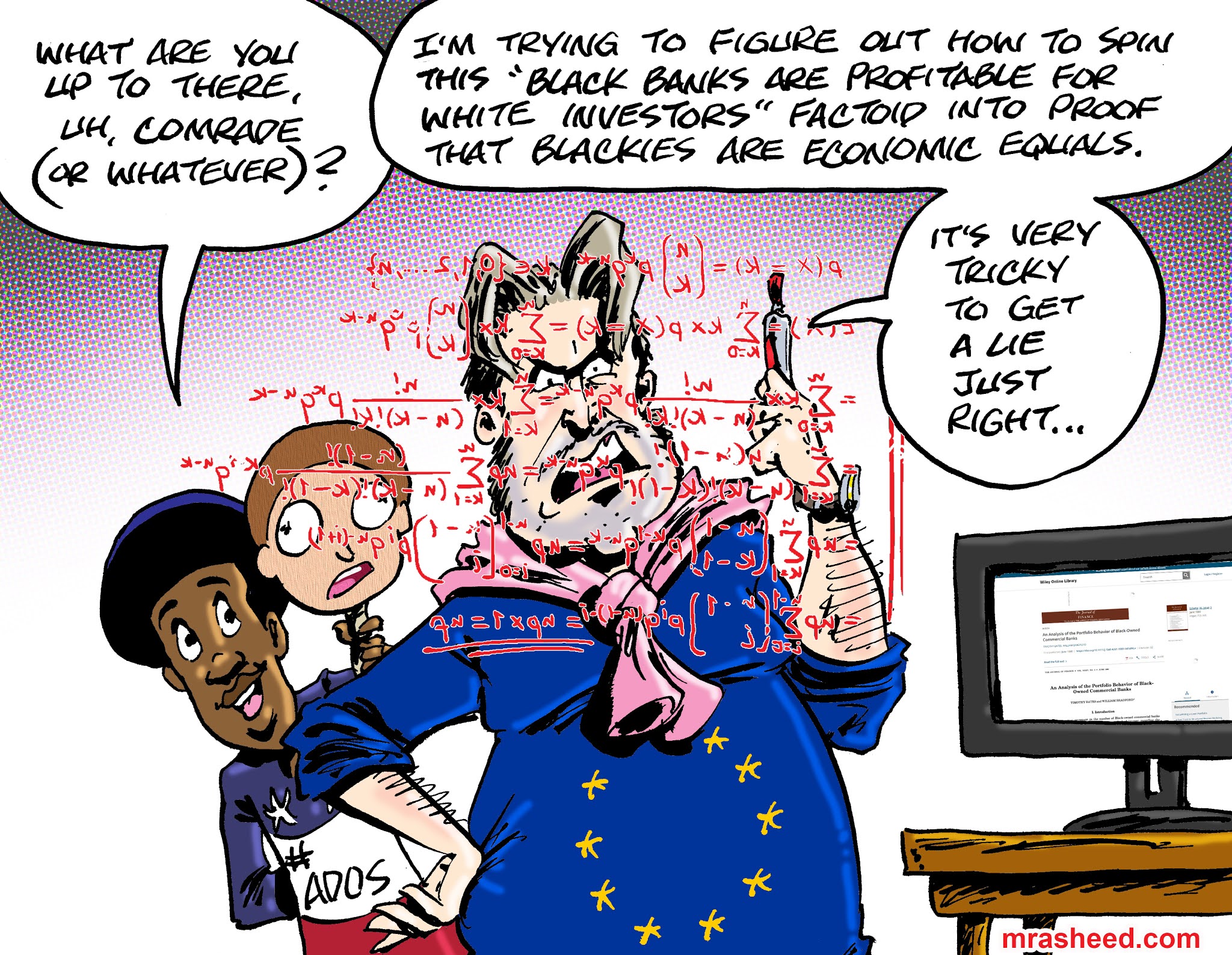 ARTIST'S DESCRIPTIONThis #MRasheedCartoons image was inspired by the ridiculous performance the other day by my foreign white supremacist stalker, who went out of his way during our last argument to find an alternate reference to "black banking" that he could stretch & spin into faux-proof that the original reference I used for black banking somehow didn't mean what I said it meant.