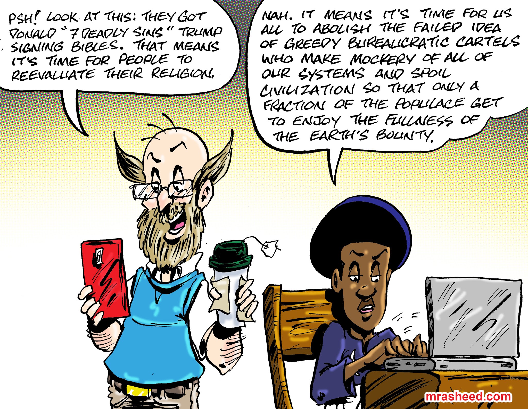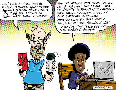 ARTIST'S DESCRIPTIONThis #MRasheedCartoons image was inspired by a LinkedIn meme that used Trump's bible signing side hustle in this way as a lame side swipe at religion. The religion is the One God's revealed message and the prophet's example in walking it out for our instruction. In the case of Christianity, in it's purest form, it would be the Christ's example in walking it out. Everything that came after the Christ, i.e., the two thousand plus years of extra stuff, bureaucratic priest craft and even the writings of Paul of Tarsus, are not the religion. The religion itself remains pure, you just have to work to find it, wading through all the stuff built up in the way, and it's all of that stuff that gives the religion its bad name since very few people understand enough to discern the religion of God from the in-the-way of mankind.
