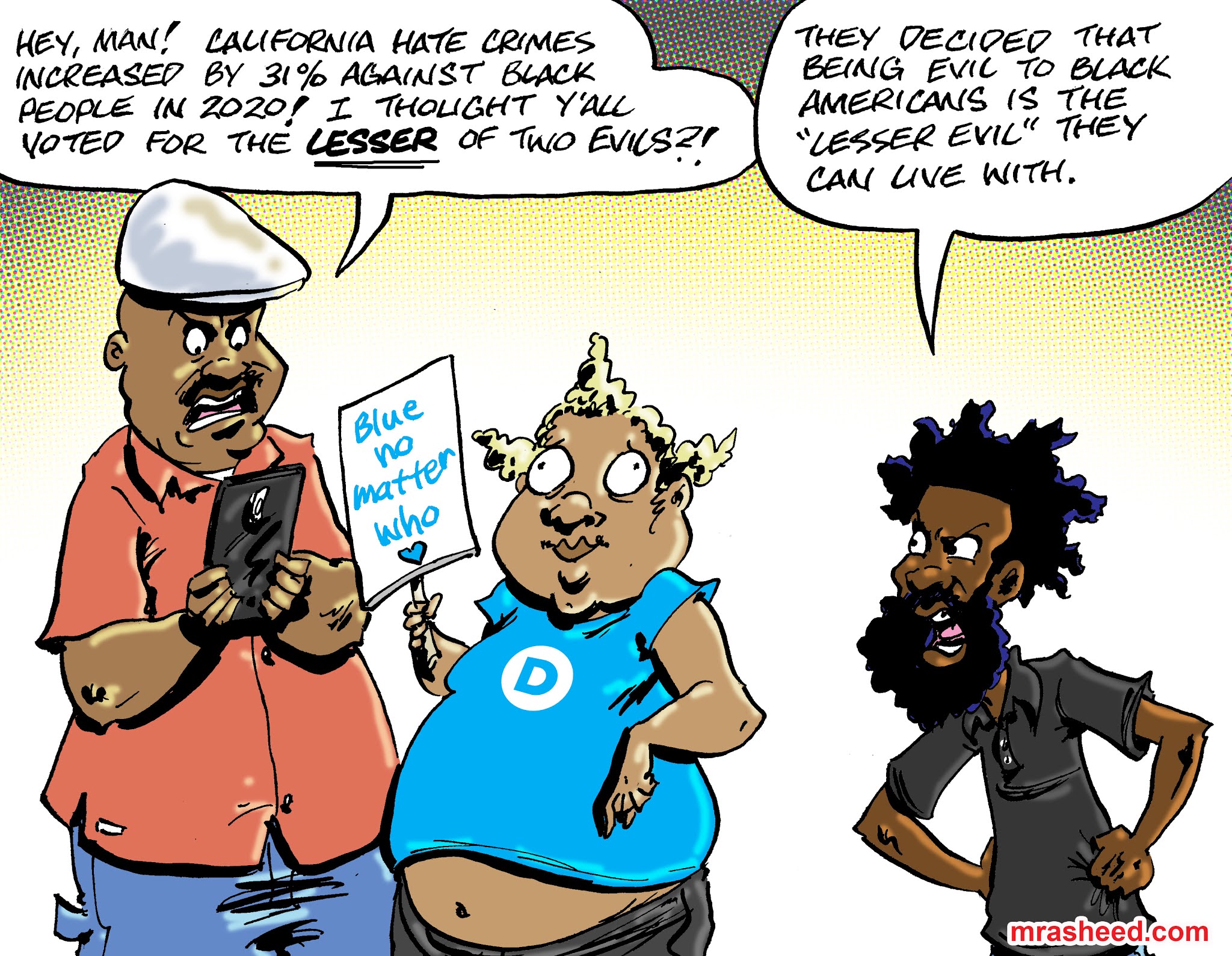 ARTIST'S DESCRIPTIONThis #MRasheedCartoons image was inspired by a weird and goofy post my foreign white supremacist stalker made earlier, where he posted some images or whatever and proclaimed, "I don't know enough about the specifics of US history to comment on [the accrued discrimination after slavery is included in our Reparations justice claim] - but.. I did find this gem [...] Looks like people do NOT agree with these race-hucksters."