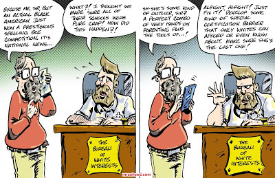 ARTIST'S DESCRIPTIONThis #MRasheedCartoons image was inspired by a comment someone wrote under one of the many articles celebrating 14 yr old Zaila Avant-garde's praise-worthy achievement as she became the very first Black American Scripps National Spelling bee champion in its 96-year history. "Look for her to be the first of many!" this random guy on LinkedIn said, which unfortunately, doesn't really track the trends of US history.