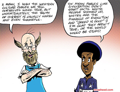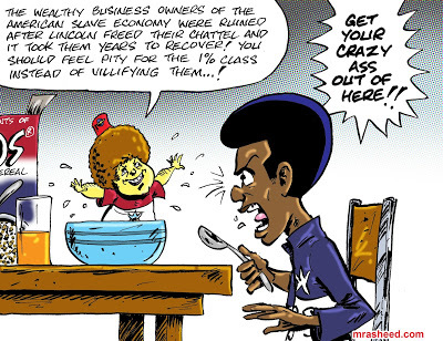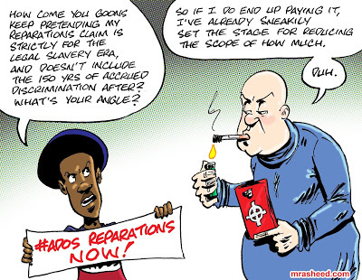ARTIST'S DESCRIPTIONThis #MRasheedCartoons image was inspired by a comment posted by one of the guys on a certain message board. He corrected a particularly crazy-as-all-hell member by pointing out that he performed the fallacy of acting as if the Black American's Reparations justice claim was only for the slavery period itself, but he over-generously (in my opinion) covered it over by giving nutso the following out:
