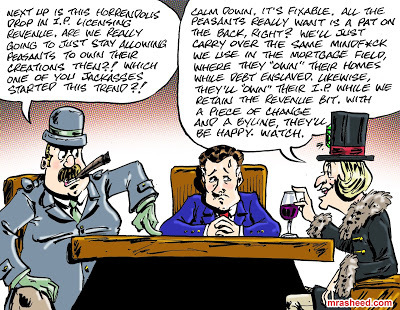ARTIST'S DESCRIPTIONThis #MRasheedCartoons image was inspired by one of those overlapping circle chart memes I saw on LinkedIn, specifically on the third bullet that read "You no longer try to show that it was your idea. You empower other people to own the idea." As it was presented, trying to be all deep & uplifting, all I saw in it was corporate grifting people — the bosses retaining ownership of the IP on the sly while giving the underpaid, overworked employee who invented the idea a paper crown and an office pizza party.