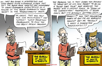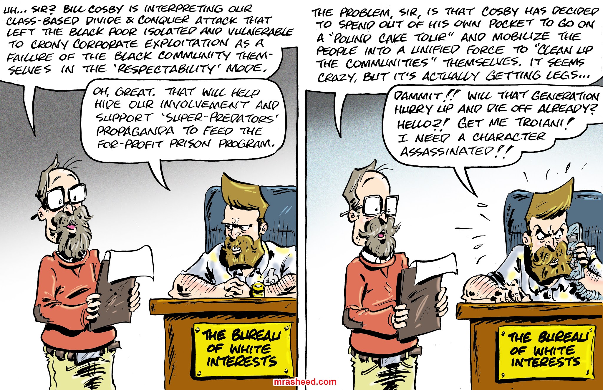 ARTIST'S DESCRIPTIONThis #MRasheedCartoons image is the latest in a series commenting on the legal troubles of legendary comedian Bill Cosby. This one was inspired by the social media comments that they didn't care about Cosby because they didn't like how he was talking to Black people from his wealthy elitist perch anyway. This is a fair critique, since Cosby's view of the Black lower economic classes was that they weren't living up to an agreement that the community as a whole should be at our best so whites wouldn't have an excuse to treat us badly. The flaw in this thinking, of course, is that whites treated us badly because they didn't want to give up the dominant economic position that they maintained by stealing our accrued inheritance wealth, so no amount of being "ten times more excellent than any white person" would EVER be good enough for them to finally start acting civilized where the Black American former slave class is concerned. But despite the flaws in Cosby's thinking, you can never say he wasn't sincere in his honest self expression in believing that what we needed to be our best selves was solid and courageous leadership... so he set out to do just that.