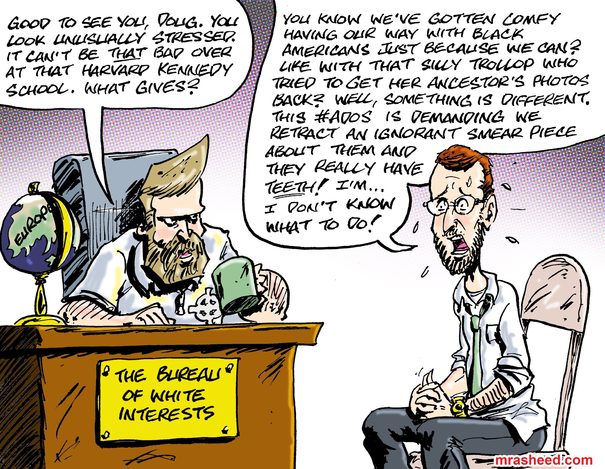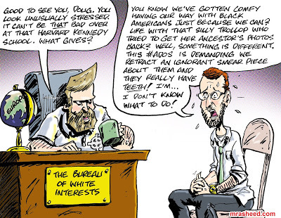 Rasheed, Muhammad. "We're Here: #ADOS Demands Retraction of Harvard's Disinformation creep Smear." Cartoon. The Official Website of Cartoonist M. Rasheed 05 Jul 2021. Pen & ink w/Adobe Photoshop color.
