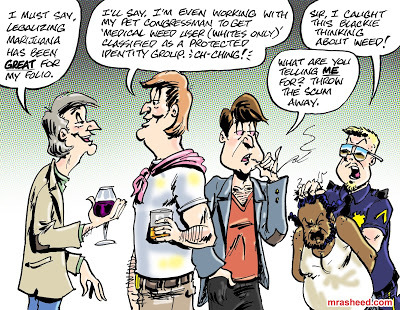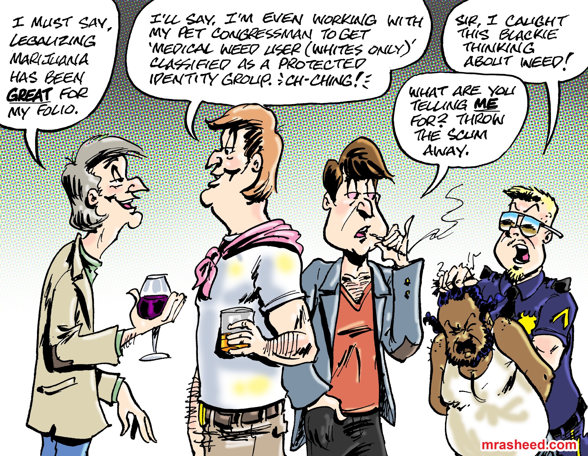 ARTIST'S DESCRIPTIONThis #MRasheedCartoons image was inspired by the fact that the Black American former slave class ethnic group is still being criminalized through marijuana, despite the drug’s celebrated recent legalization and mainstream acceptance as a wealth-building commodity product by the 1% racketeering grifter class. Starting with Harry Anslinger’s obsessive and racist persecution of jazz-swing superstar Billie Holiday, the decades of legislature layers that fixed targeting Black Americans for middle passage drug-related arrests to fill the for-profit prisons will take a lot of work to unravel – efforts that cannot be done in a single Executive Branch administration even if he/she was 100% committed.