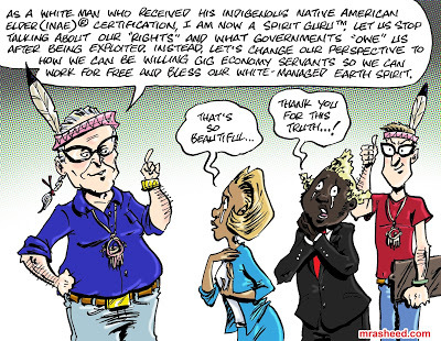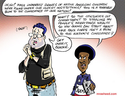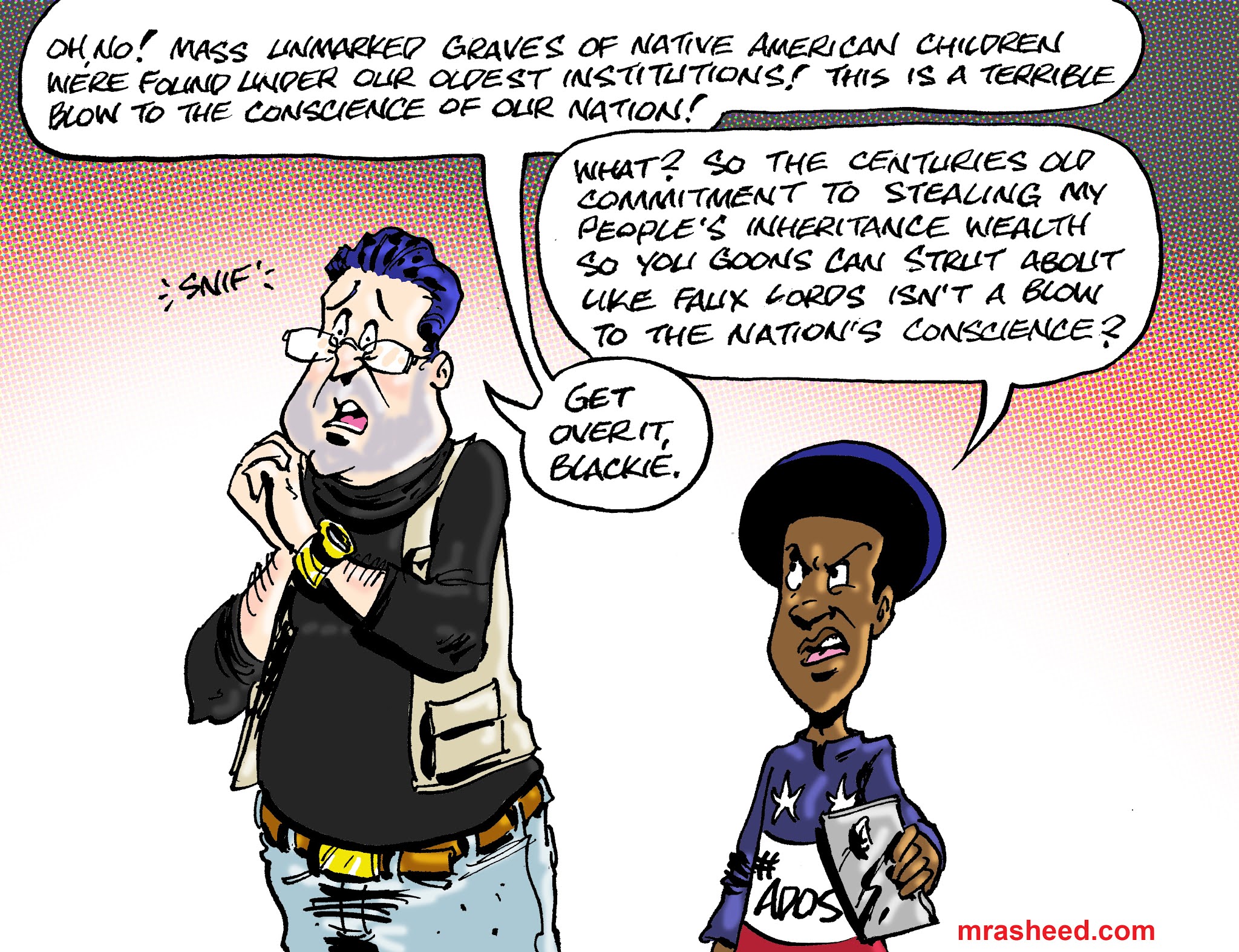 ARTIST'S DESCRIPTIONThis #MRasheedCartoons image was inspired by a Tweeted demonstration of fake selective moral outrage that expressed that the USA no longer had a clean conscience because some evidence assaulting the native Americans of old came to light. Literally the reason for the monied class to inflict genocide upon a people is because they don’t want to share wealth, land & rule with a perceived rival group, so they unleash the tools of evil to support their “for love of money” source evil. The 400 yrs of systemic economic oppression upon the Black American former slave class represents the ultimate form of that source evil as our continued exploitation & plundered inheritance wealth never stopped being the number one blow against the nation’s conscience.