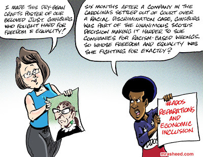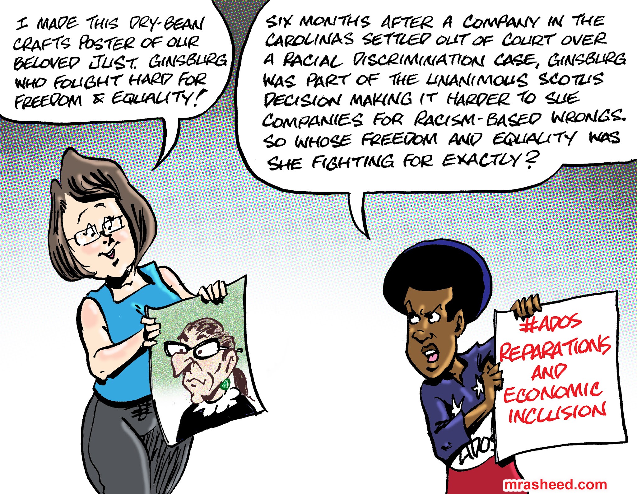 ARTIST'S DESCRIPTIONThis #MRasheedCartoons image was inspired by the anti-Black American traits displayed in the record of "pop culture legend" and champion of women's rights Associate Justice Ruth Bader Ginsburg. I wouldn’t say anything if she was ONLY a champion for gender and LGBT issues, but unfortunately, she frequently voted against the interests of the American Descendants of Slavery in order to give her preferred groups their come ups. Justice Ginsburg interpreted the 1964 Civil rights Act broadly when it benefitted her groups, but interpreted the Act as narrowly as possible to deliberately snub ADOS. This was unacceptable. So why are Black Americans celebrating her as if she was our champion when she so clearly was not?