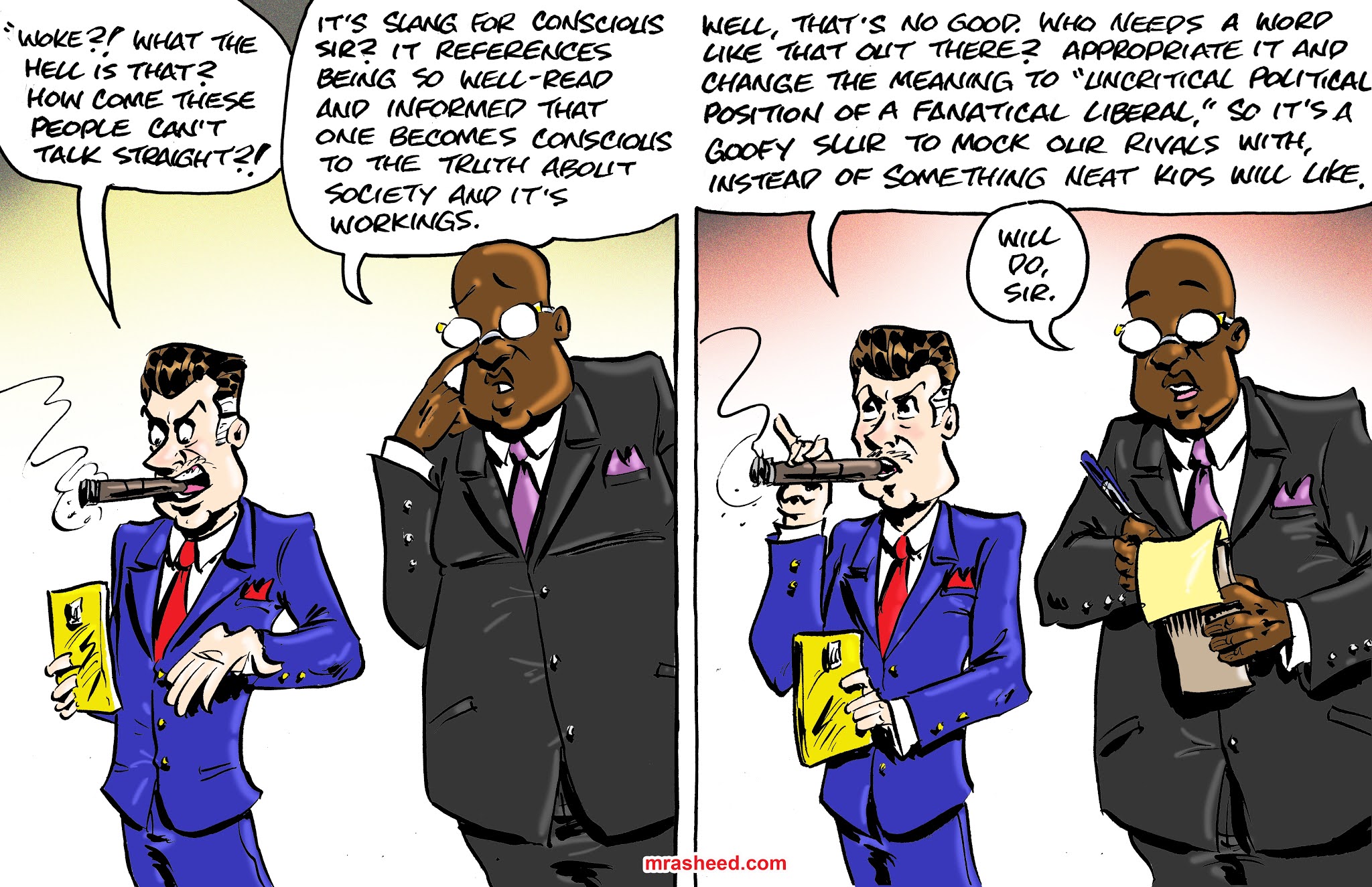 ARTIST'S DESCRIPTIONThis #MRasheedCartoons image was inspired by how the white racist run mass media has appropriated the term "woke" to use for their nonsense. See my #3 bullet in this Notes While Observing link.