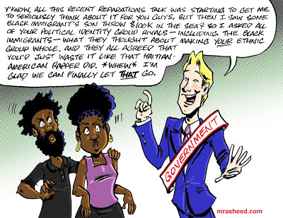 ARTIST'S DESCRIPTIONThis #MRasheedCartoons image was inspired by all of the rival & enemy groups to the American descendants of slavery who love speaking for us and telling us what we need, et cetera. Make no mistake, this chronic disrespect is greed-fueled and designed to specifically to keep us economically excluded from the benefits of the USA provided by our free labor and exploitation.
