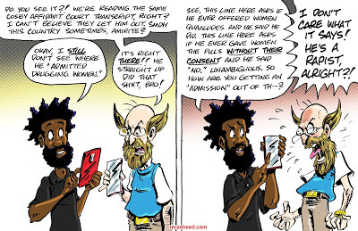 ARTIST'S DESCRIPTIONThis #MRasheedCartoons image was inspired by the ridiculous comments infesting social media about the release of comedian Bill Cosby from prison. These are, of course, the people who believe that Cosby is a rapist, despite their inability to prove this is so. The reason why he wasn't arrested before, is because none of the accusers were real -- it was a "long con" which is: