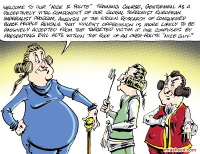 ARTIST'S DESCRIPTIONThis #MRasheedCartoons image was inspired by the widely-used tendency of my opponents among the white racist aristocracy to respond to passionate arguments over content that is passionate by its nature as if the content isn’t valid because of it (red herring > ad hominem > Tone Policing). I noticed that this is a normal fallacy widely used by the mainstream, and combined with the “banality of evil” concept as explained by Edward Snowden, as well as numerous examples of wrongdoing being downplayed because the [white person] performing it was “being nice,” the tactic of using niceness/politeness as a highly effective and disarming “war mask” is thus revealed.