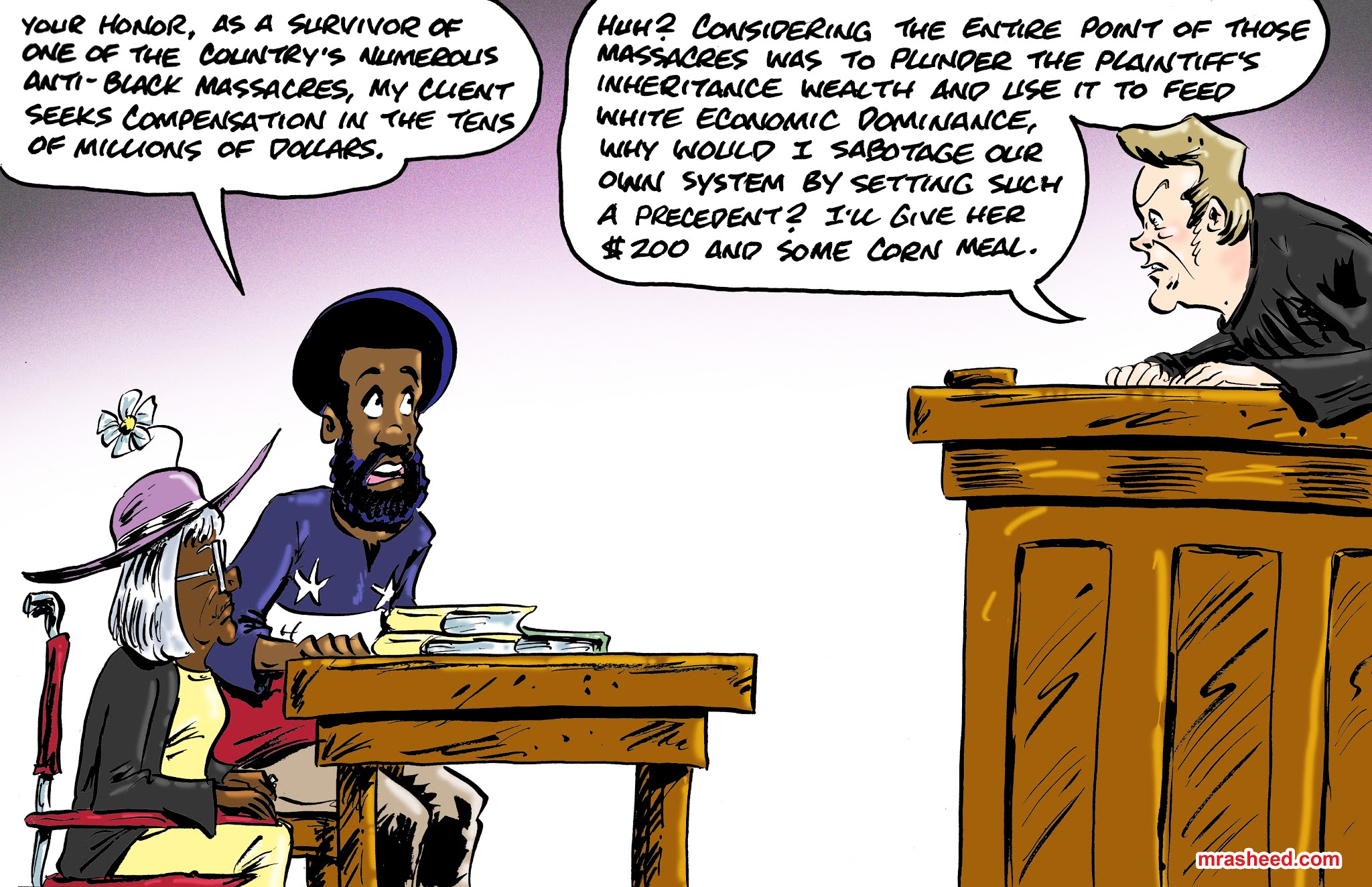 This #MRasheedCartoons image was inspired by an article describing the cancellation of the Tulsa Race Massacre Commemoration Event due to officials rejecting the amount the survivor's asked for their reparatory justice compensation.
