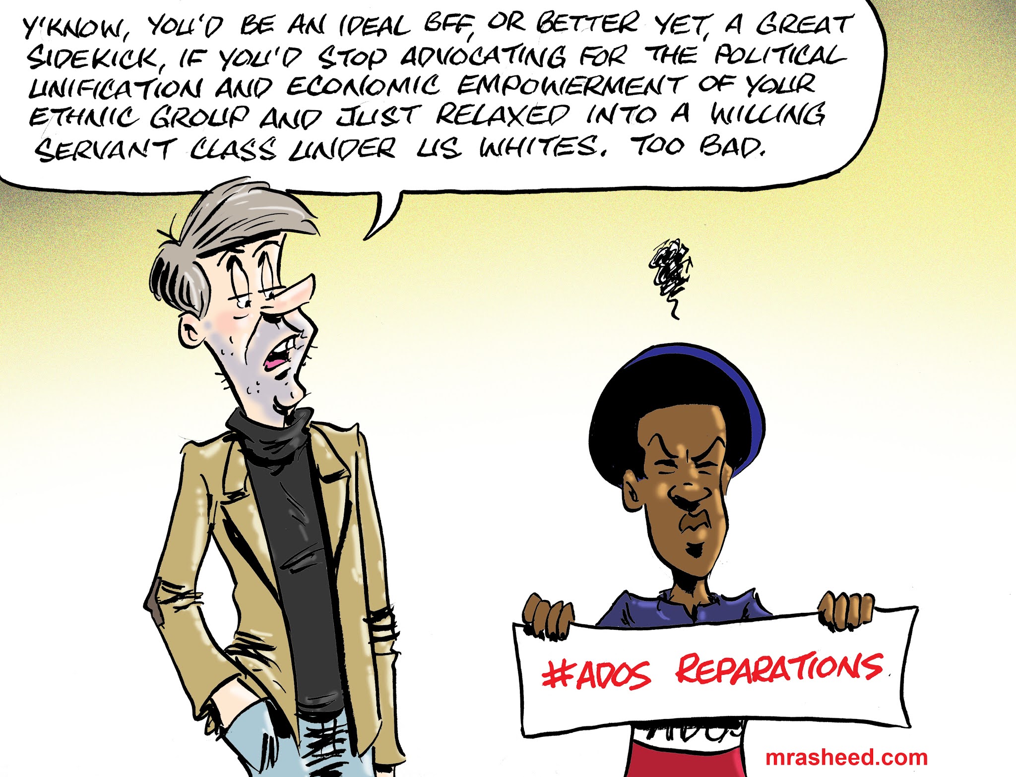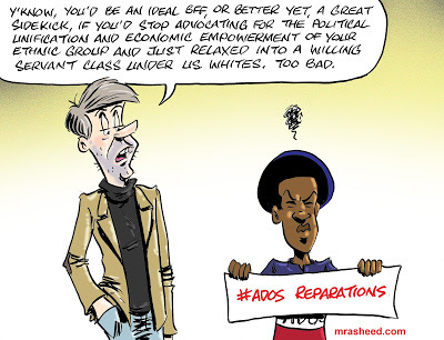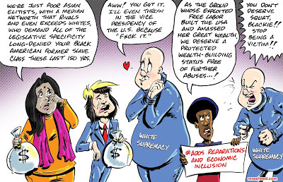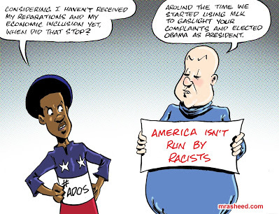 This #MRasheedCartoons image was inspired by all of the "America isn't racist" talk going on recently, spurred by Sen. Tim Scott and VP Kamala Harris. The old saying that you can tell how healthy a company or country is by how it treats its most vulnerable citizens holds true here. How the leadership class of the United States has treated the American Descendants of Slavery ethnic group has always determined our racism levels. Currently, ADOS remains the most disrespected, most exploited group as it is unofficial policy to subjugate us into a wealthless bottom caste -- a state we've fought to escape from for all of our 400 yrs in North America.