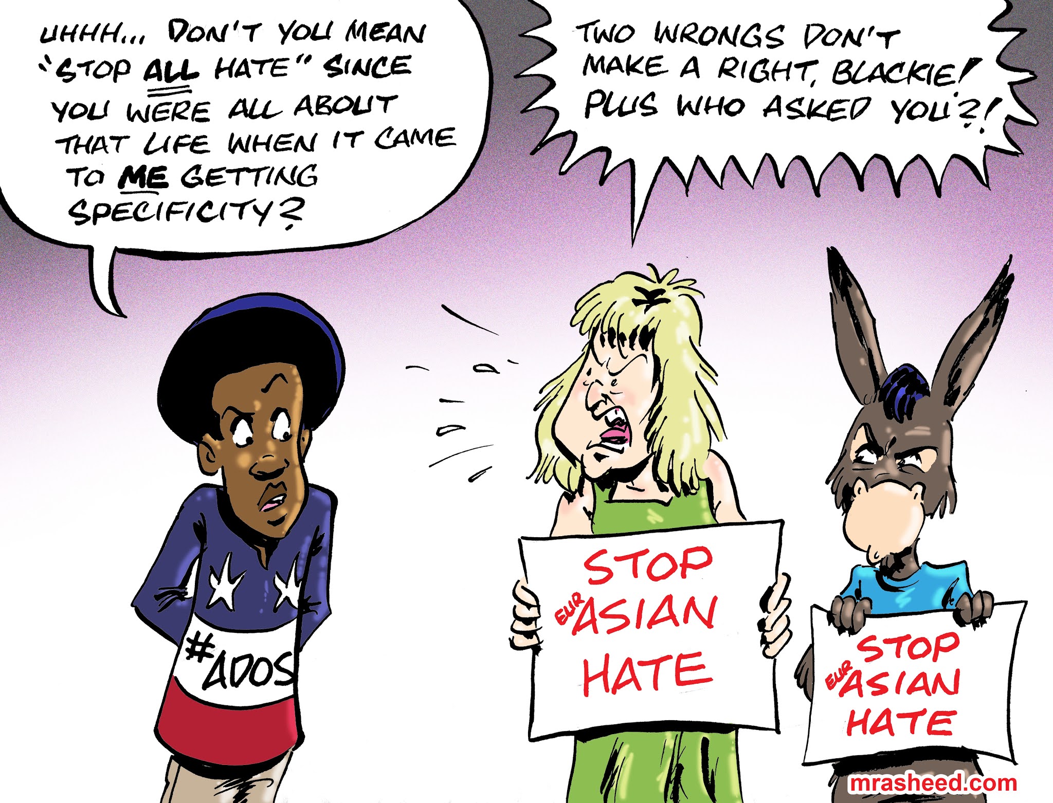 This #MRasheedCartoons image was inspired by the lightning quick drafting, signing and implementation of the Anti-Asian Hate Crimes Bill triggered by a very recent violent terror event. Like the Japanese Internment Reparations Bill before it, it represented specificity for a special interest group that was passed quickly & decisively despite complaints from dissenters because it the right thing to do.