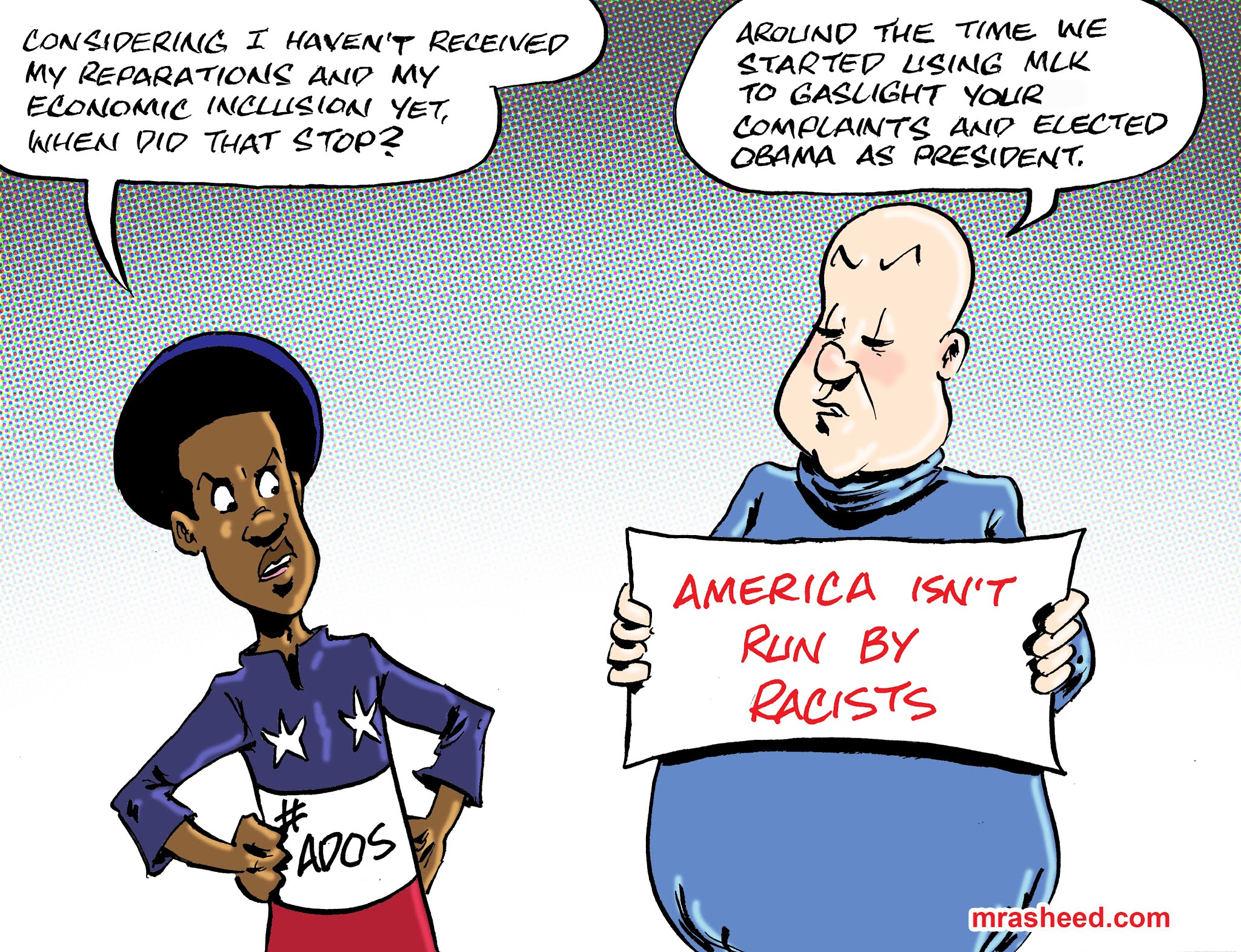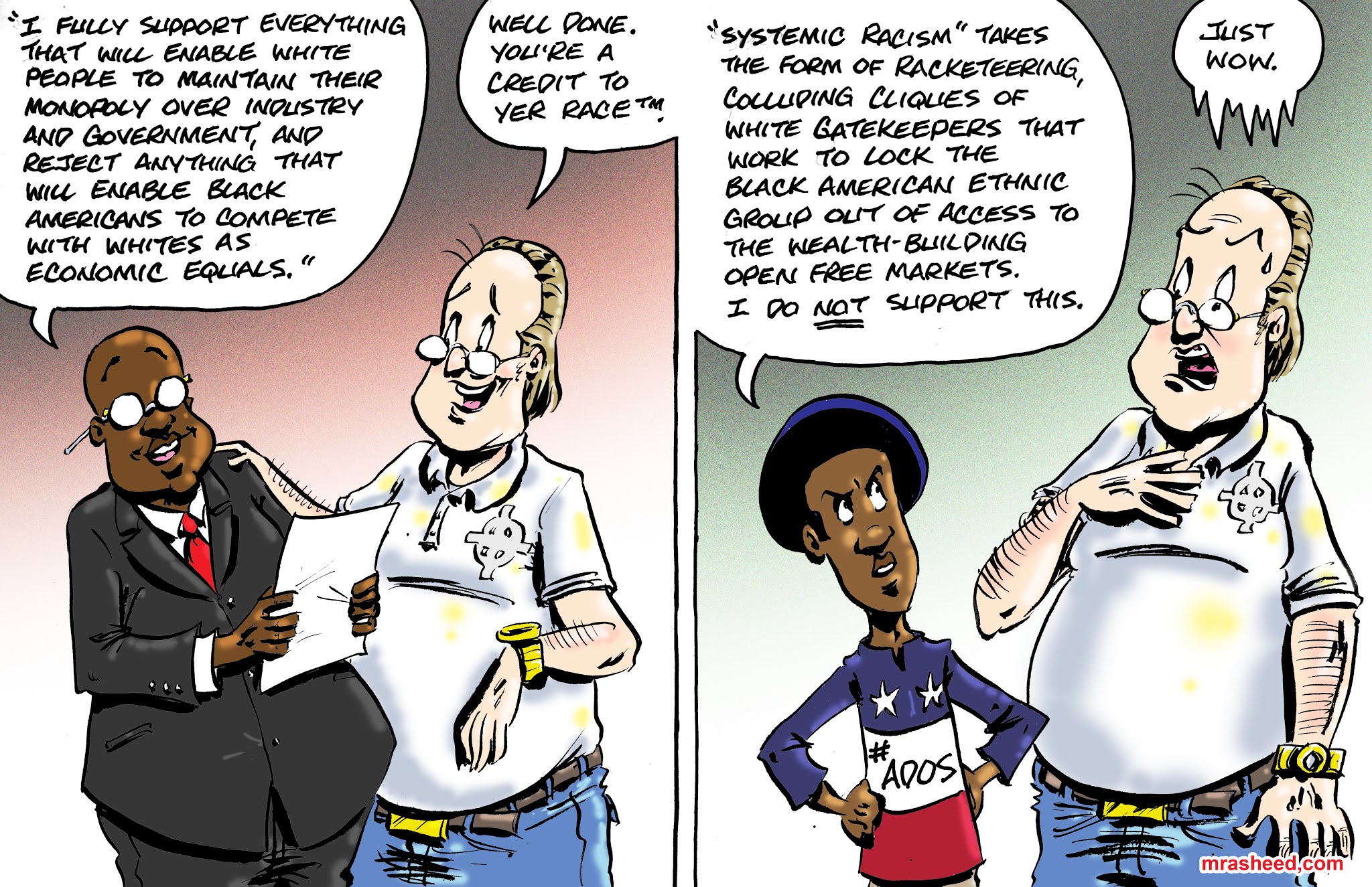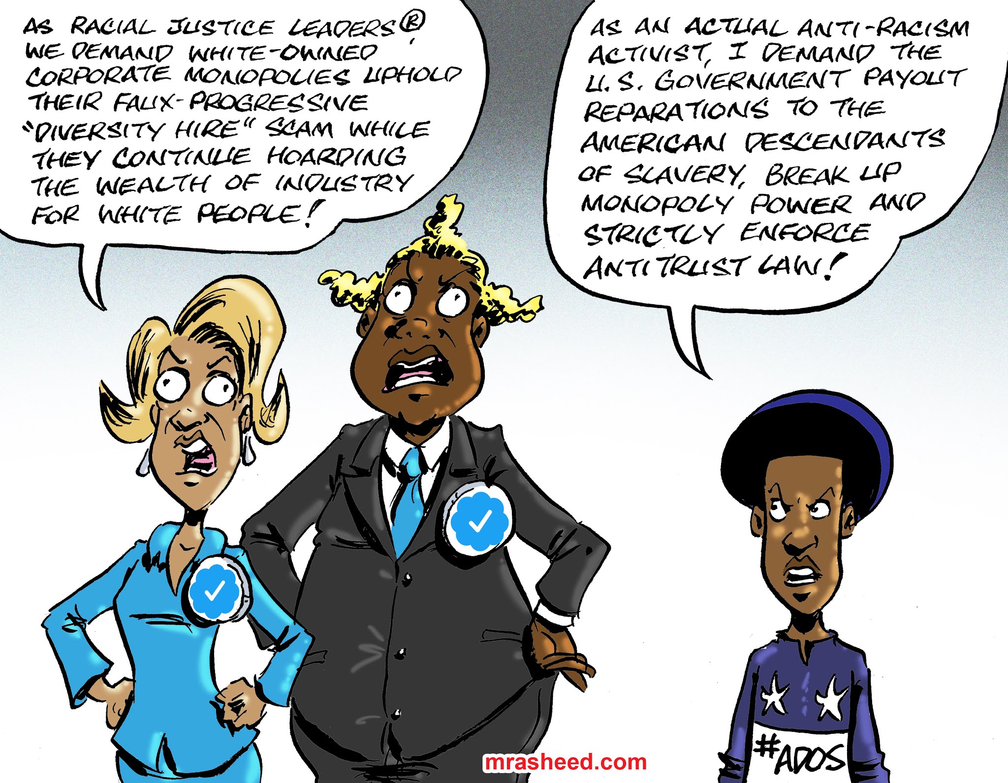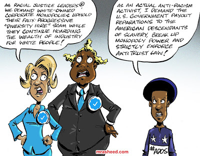 ARTIST'S DESCRIPTIONThis #MRasheedCartoons image was inspired by the use of "racial justice leaders" in several posts throughout social media, as the professional "diversity & inclusion" crowd work to pretend to address systemic racism by enabling the Fortune 1000's antitrust laundering schemes.