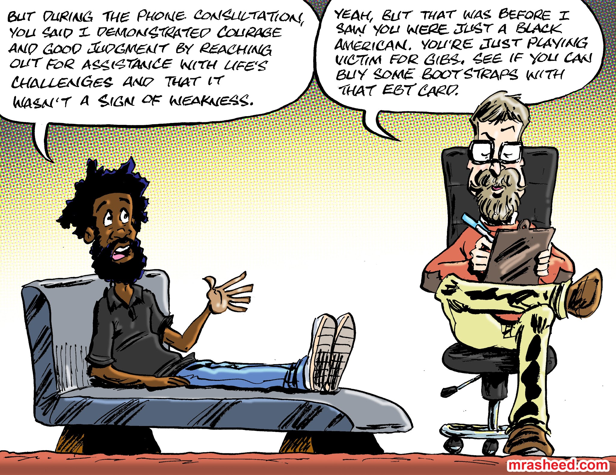 This #MRasheedCartoons image was inspired by a line with a training instruction that said it was important we realize that it wasn't a weakness to reach out for help with life difficulties. This reminded me of a recent argument where a while supremacist continuously dismissed the anti-racism activism bullet points of the American Descendants of Slavery as "victimhood" and a lack of personal career motivation no matter how many times I explained it wasn't about what he was trying to gaslight it into.
