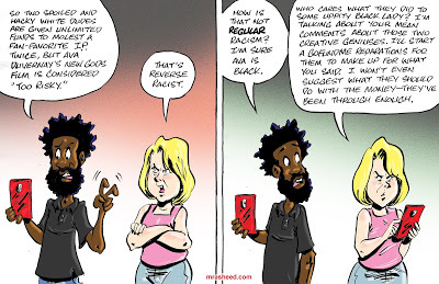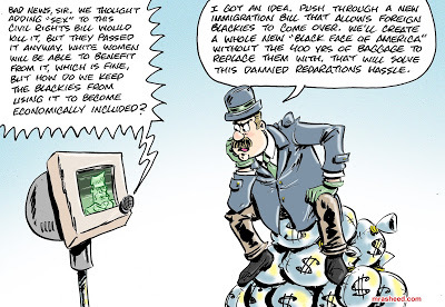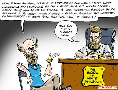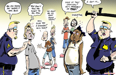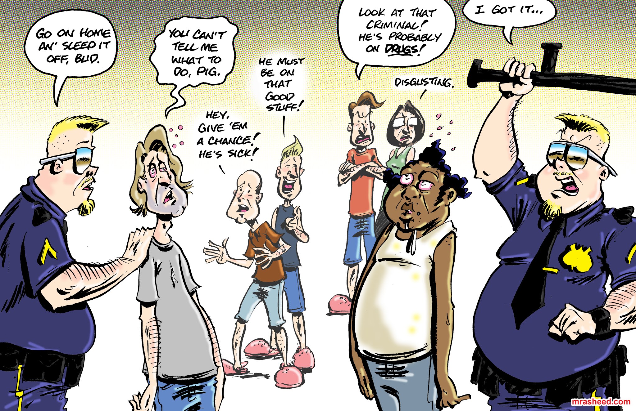 Rasheed, Muhammad. "To Protect & Serve (Whites Only)." Cartoon. The Official Website of Cartoonist M. Rasheed 05 Apr 2021. Pen & ink w/Adobe Photoshop color.