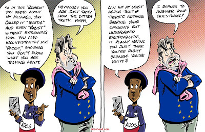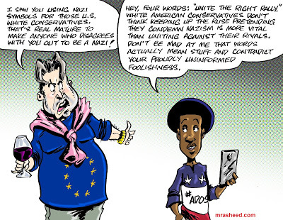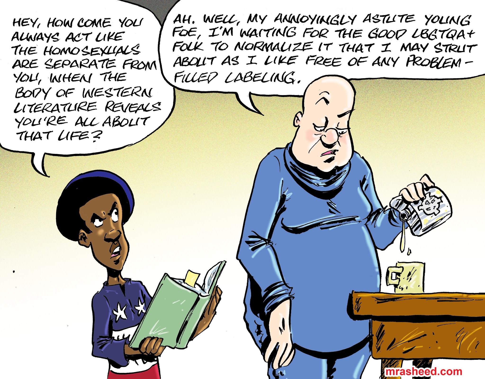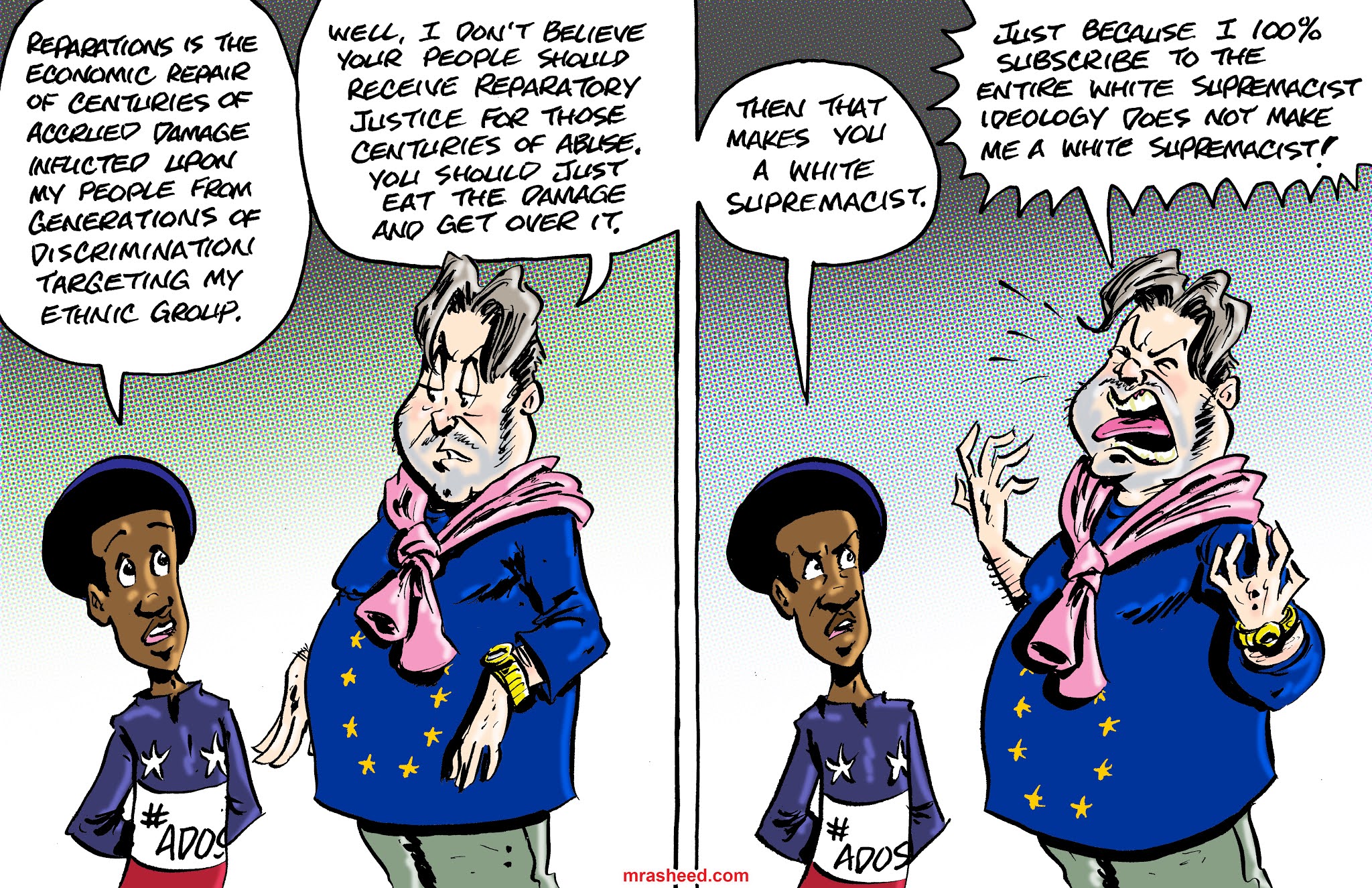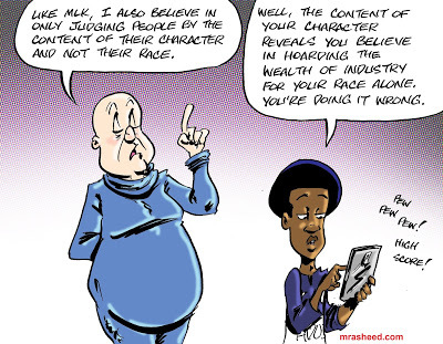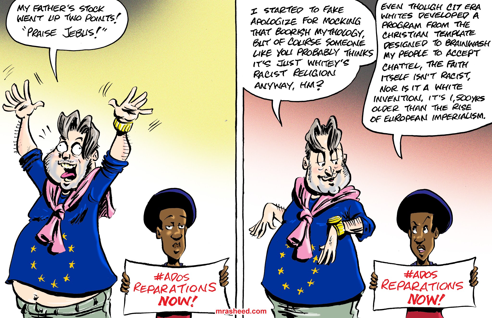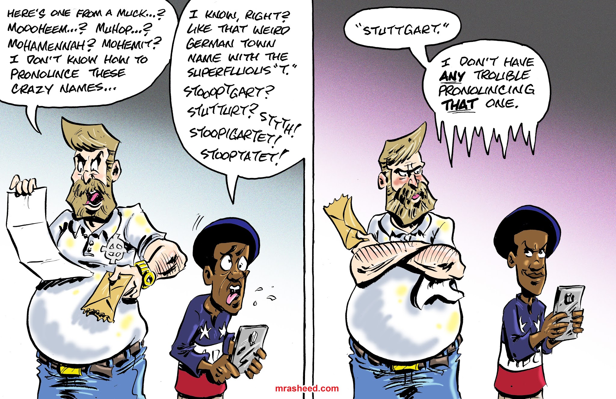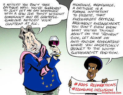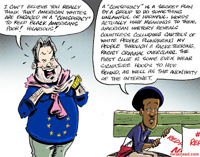 Rasheed, Muhammad. "A Racist's Demonstration of Atheistic Laziness." Cartoon. The Official Website of Cartoonist M. Rasheed 31 Mar 2021. Pen & ink w/Adobe Photoshop color.